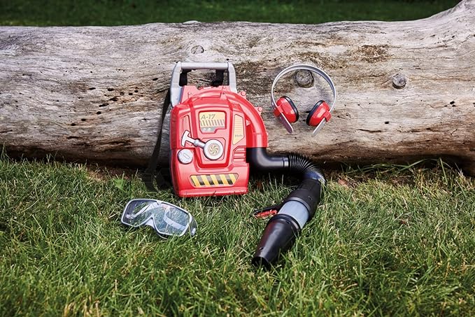 Wearable, kid-sized backpack leaf blower. Press the button to activate the simulated blowing action and sounds. Included goggles and earmuffs which store inside!