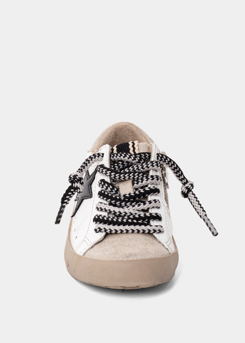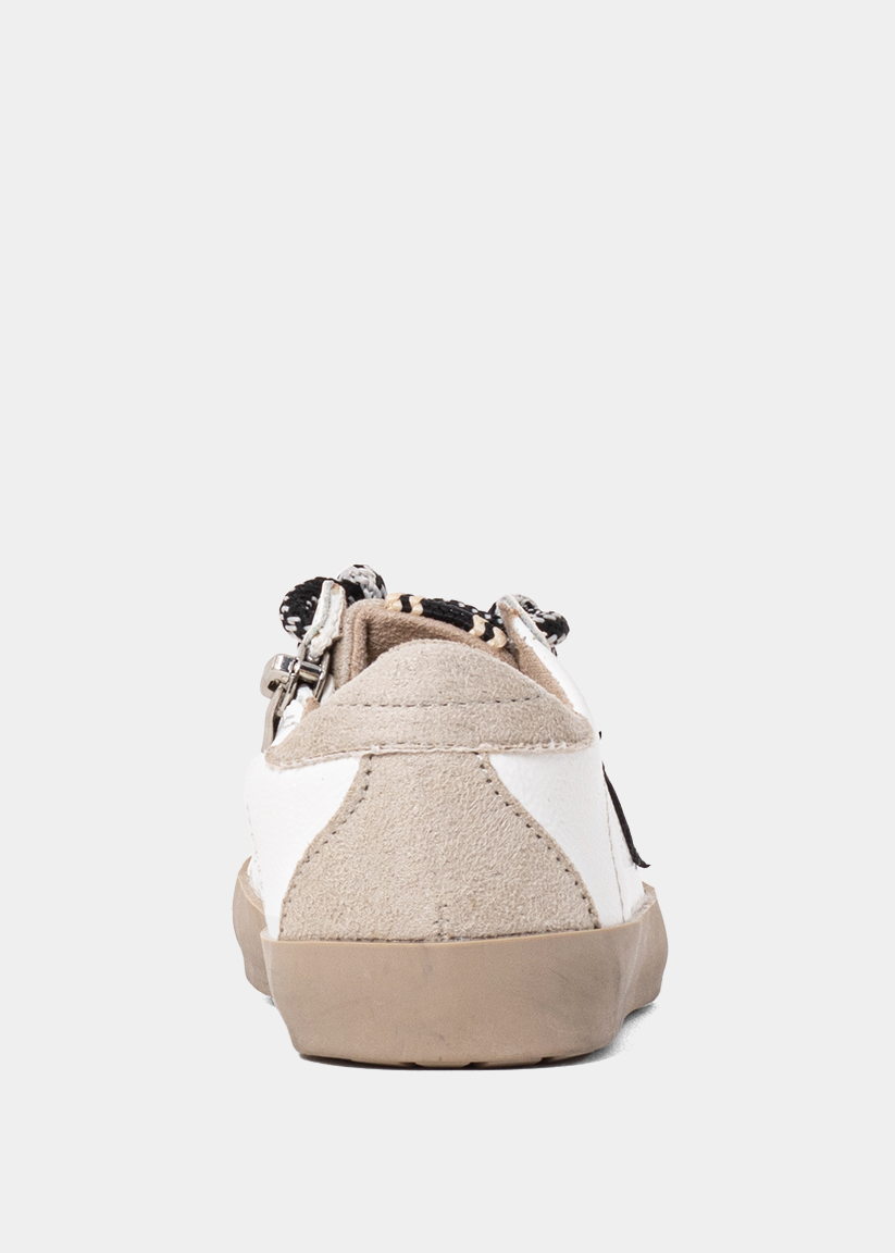Designed for little feet with big style, the PAULA MINI in Black and White blends playful energy with elevated design. This kid's sneaker features a bold black star, contrast heel tab, and smooth faux leather panels that mirror our best-selling adult version. The black-and-white speckled laces add a sporty twist while ensuring a secure fit. Plus, toddler sizes include a side zipper for quick on-and-off- no more morning delays. Finished with a cushioned insole and flexible sole, it's made for all-day adventures in comfort and style.