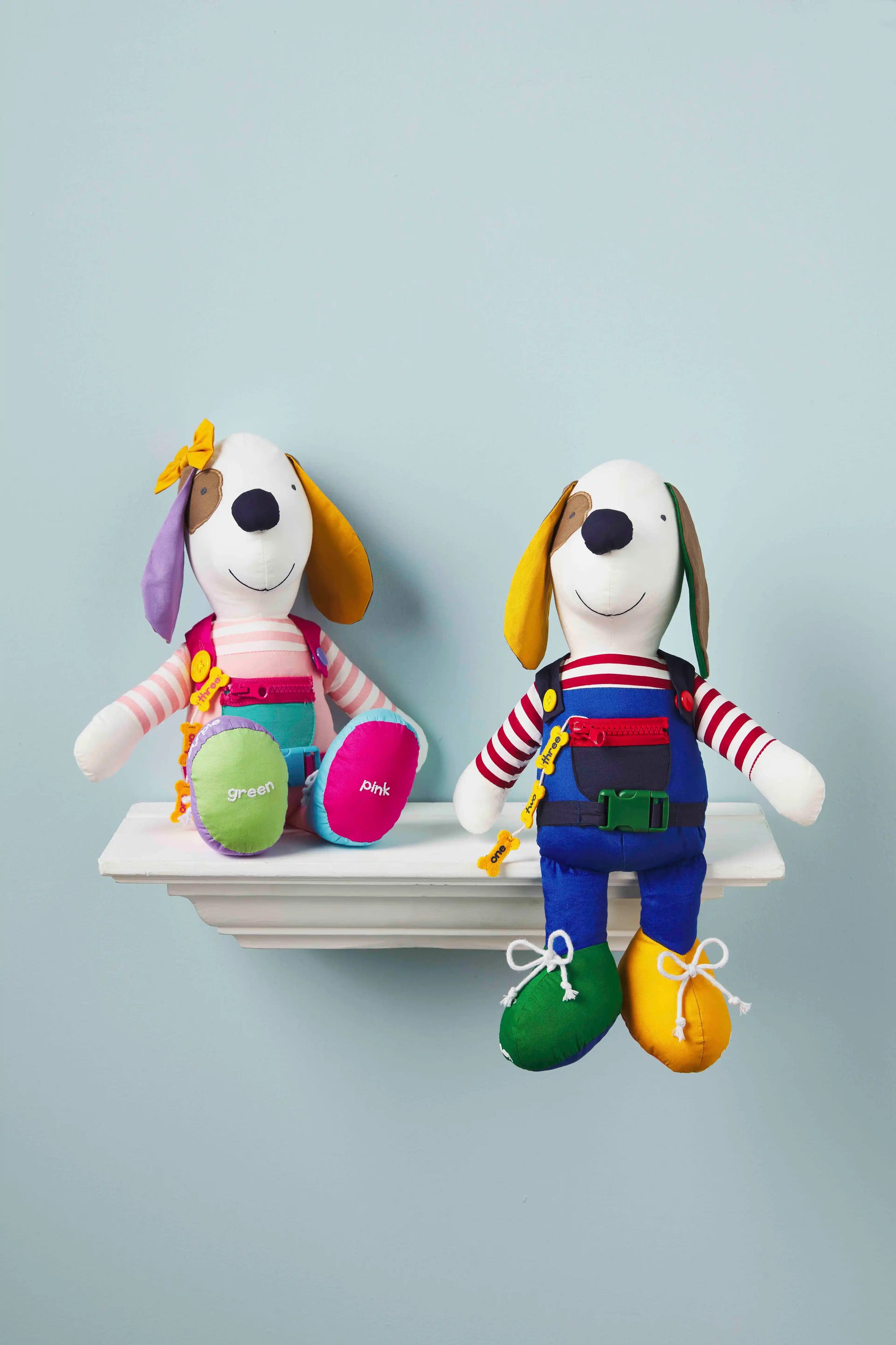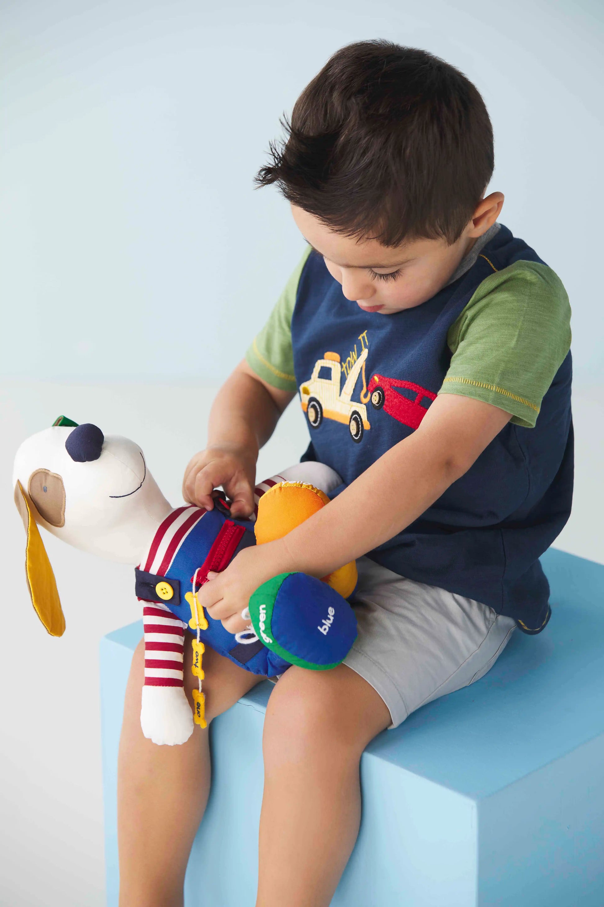 Keep baby busy with our Blue Learn and Play puppy. The poplin plush pal keeps baby busy with developmental activities. Your child can learn with a friend. The puppy pal helps teach your child to zip, snap, buckle, and button. It'll also help the child learn to count, identify colors and even tie a bow.