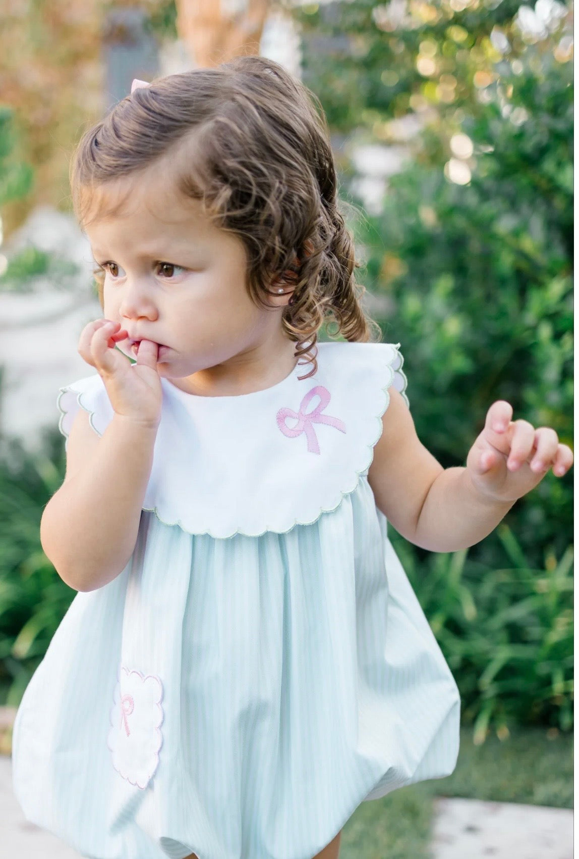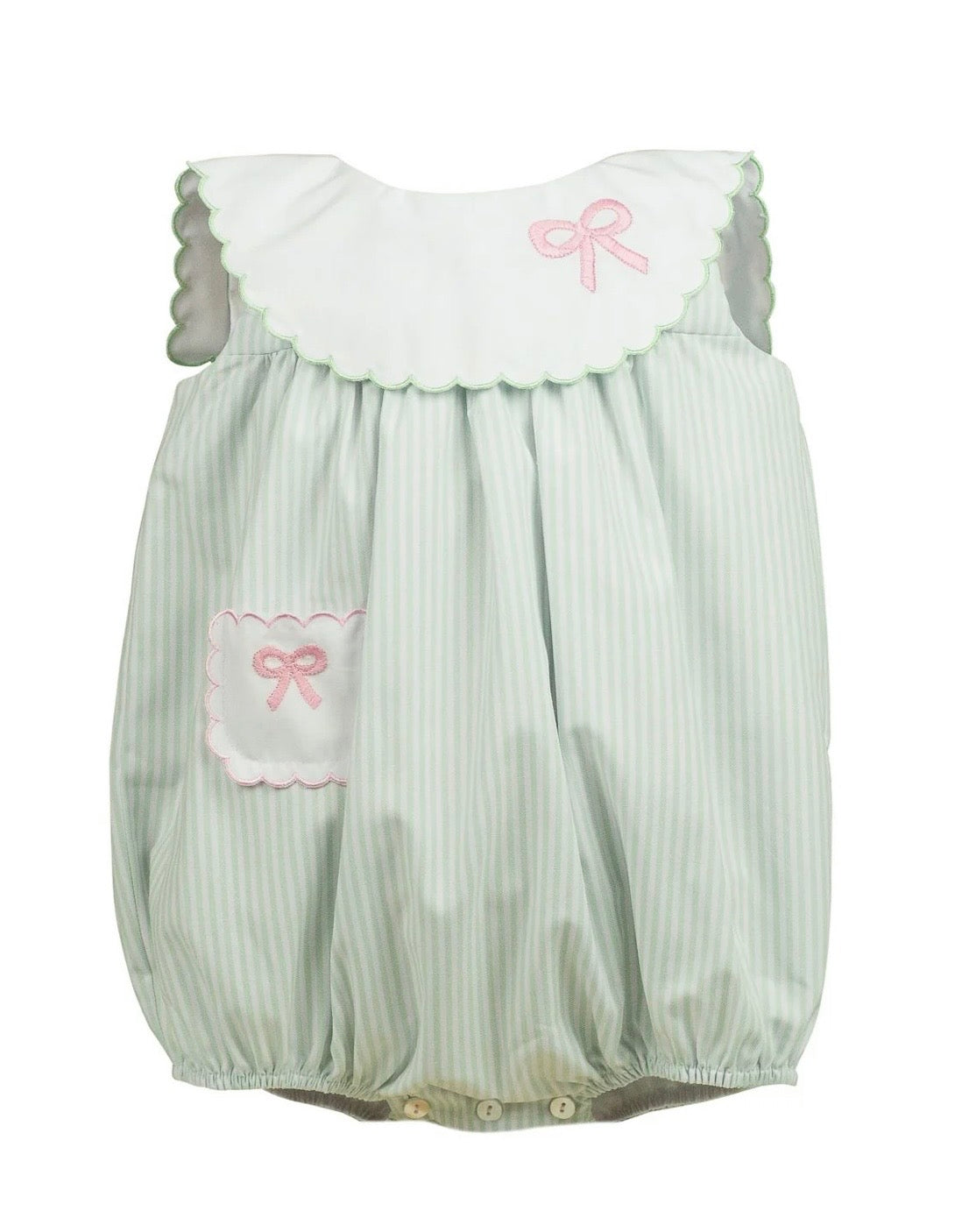 Adorable bubble romper featuring soft peony mint striping with delicate pink bow embroidery details. Perfect for baby girls who love a touch of sweetness and style. The charming bow accents add personality to this comfortable, everyday piece that's as cute as it is practical for playtime and special occasions alike.