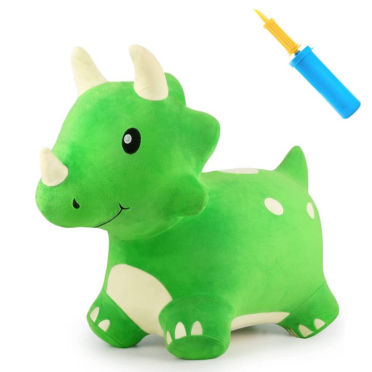 This hopping Dino outside features a soft plush cover and the inside is eco-friendly rubber. Happy Triceratops Dinosaur want give you a safe and pleasant play.