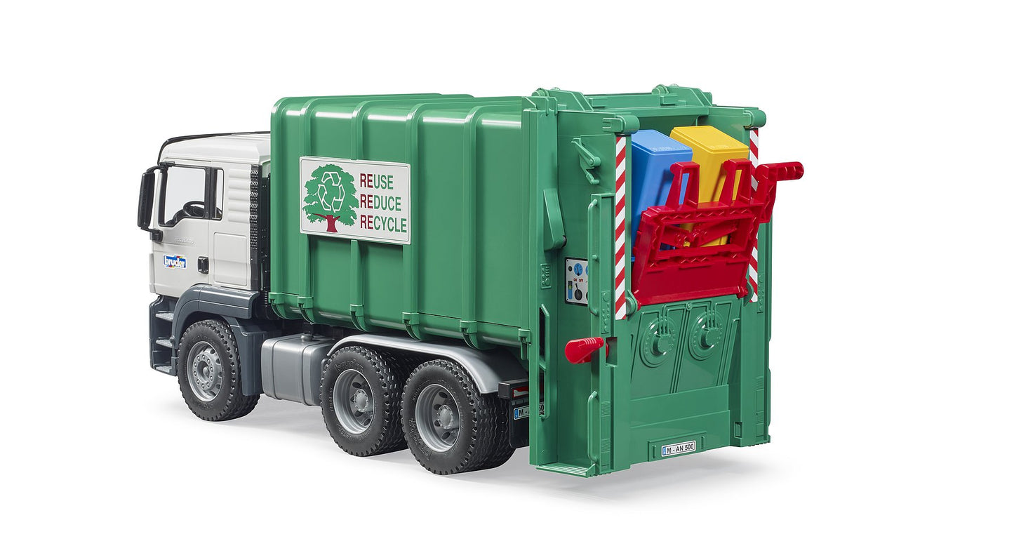 This MAN TGS Rear Loading Garbage truck is ready for trash pick up day! The Process: Empty small refuse bins or containers into the back of the truck, the spindles turn the refuse into the container, and when the container is ready to be emptied, the opening rear flap that can be locked into position and the container can be tipped to empty out the load. Two refuse bins included. A great addition to this truck is item no. 02607 featuring three small and one large bin.