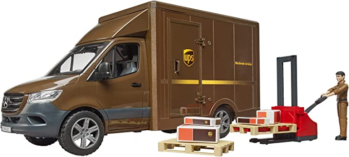 Pioneering, efficient, reliable – this is how Mercedes Benz describes the new Sprinter. The latest generation Sprinter continues to be the versatile and popular transport professional. BRUDER’s extensive range includes the latest sprinters in a wide range of designs. UPS, one of the world's leading shipping service providers, also relies on Sprinters as delivery vehicles. This vehicle dominates today's city streets and has now been added to the BRUDER range. The vehicle features a two-part rear door that can be opened up to the limit stop on the body of the vehicle. Remove small items through the side door to save time. The vehicle's accessories include a manual pallet jack and two Euro pallets to load or unload heavy and/or bulky goods. This great set is rounded off by a UPS driver wearing the company's typical uniform. Typical UPS shipping boxes in different sizes are also included.