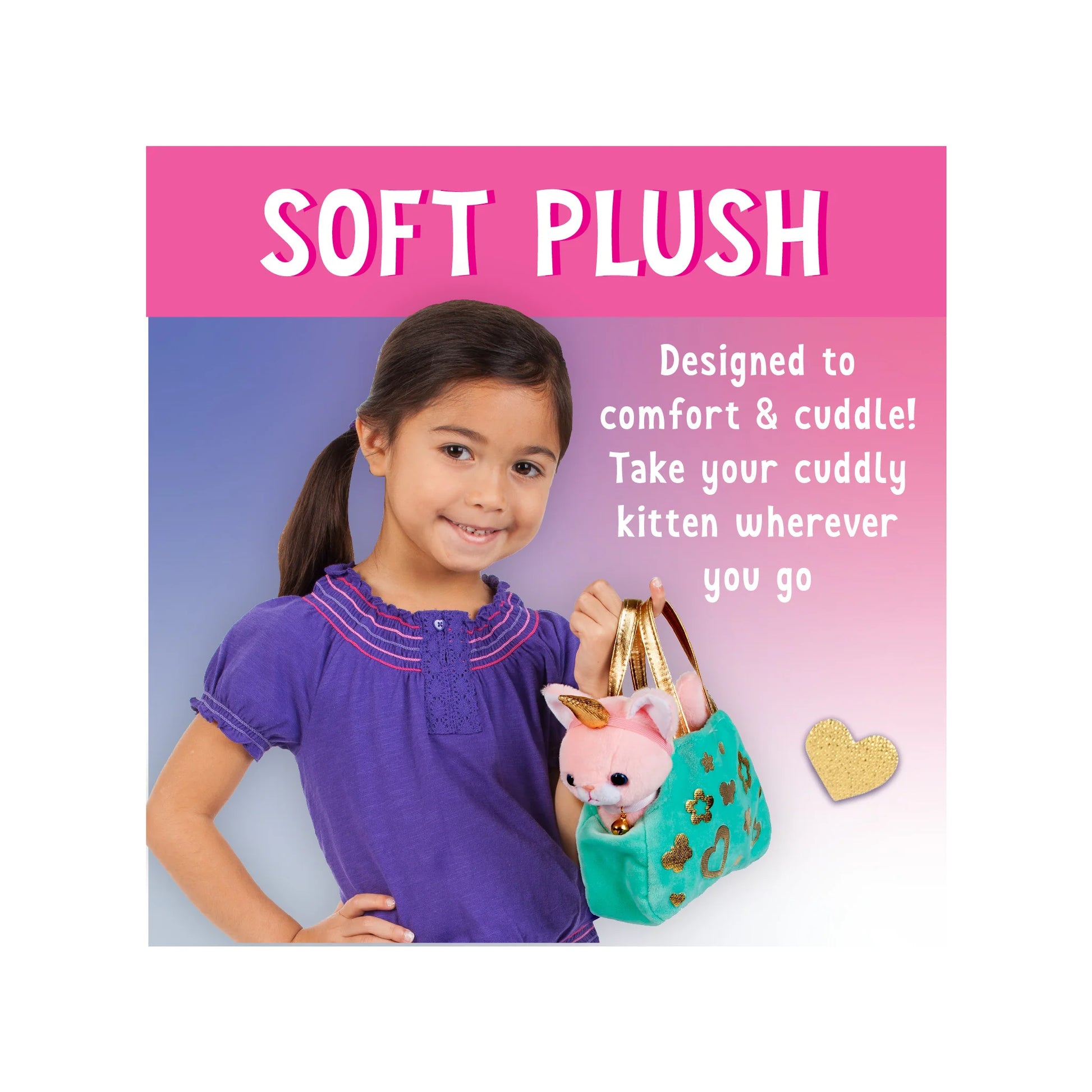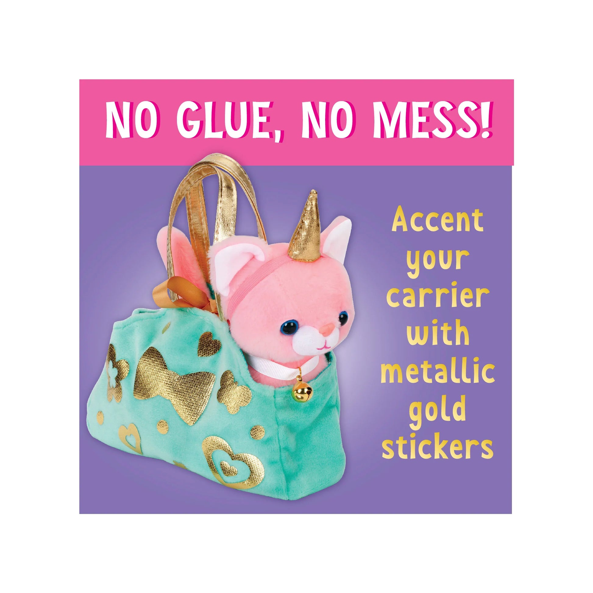 This cuddly kitten will be your purr-fect crafting companion. Decorate this plush kitten and velvety pet carrier with an array of adorable accessories including: ribbon and bell collar, metallic gold stickers, unicorn horn and shiny butterfly wings. No glue, no mess! Develops fine motor skills, fosters imaginative play and promotes sensory development.