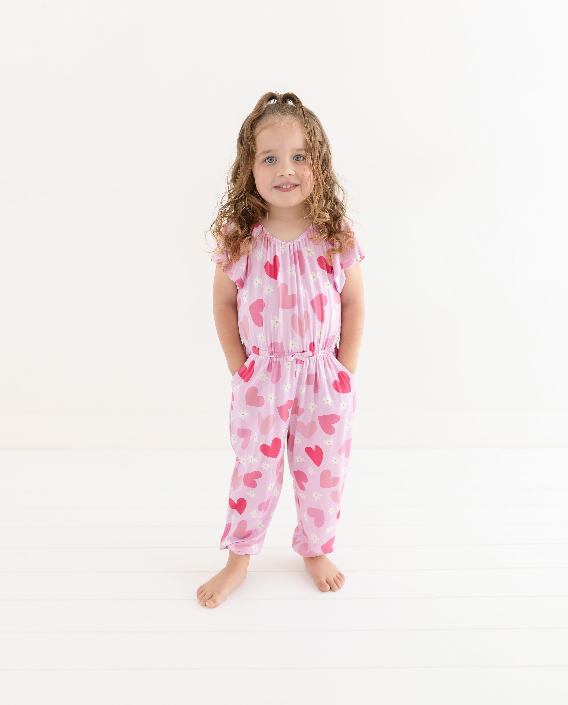 The Posh Peanut Daisy Love Jumpsuit is a stylish and comfortable one-piece outfit adorned with charming daisy & heart patterns, combining fashion and ease for little ones.