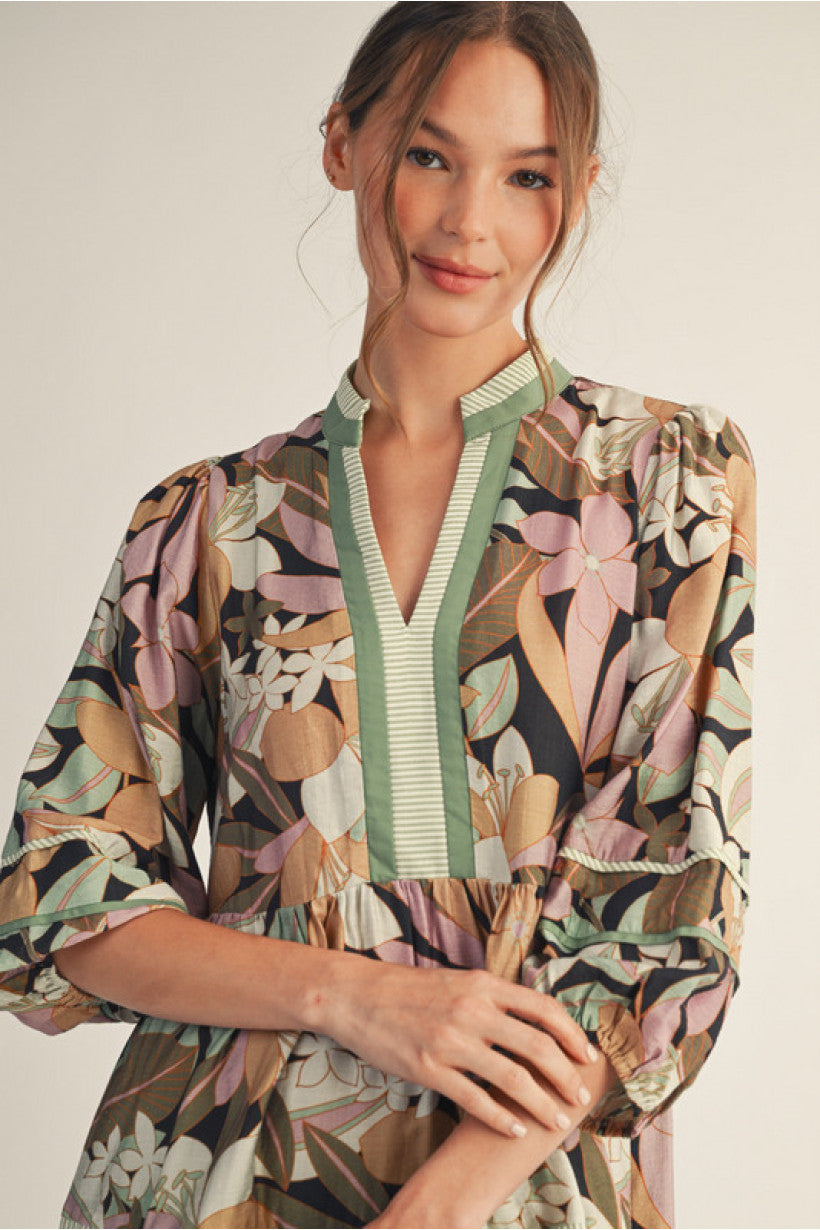 This charming 3/4 sleeve dress features a playful floral tiered design with a subtly stylish mock neckline. The solid and stripe contrast adds a fun twist, while handy side pockets keep essentials close at hand. Perfect for twirling through warm days with effortless flair.