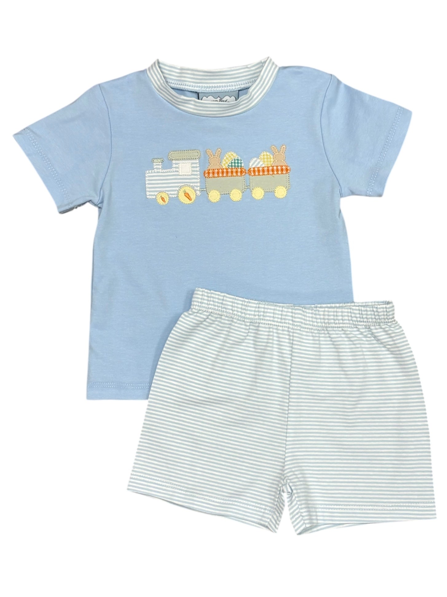 All aboard for Easter fun! This vibrant train-themed short set puts little ones in the conductor's seat of springtime style. Featuring bold, playful graphics and a comfortable two-piece design, it's perfect for egg hunts, family photos, or casual weekend adventures. The soft fabric keeps kids moving freely while the eye-catching train motif makes them the star of any Easter celebration. Dress them up or keep it casual—this set delivers personality and comfort in one unstoppable package.