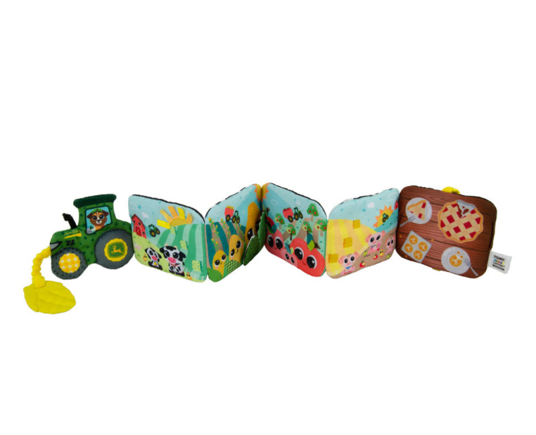 Tasty travels await both you and your baby with Lamaze’s John Deere Farm to Table Journey discovery toy. Whether exploring the open pages on the floor or sitting with baby in a chair, this accordion style picture book features two sides of fun you can share with your little one. Unfold it and discover a high-contrast side, great for younger babies, with black-and-white illustrations and a simple farm theme with different textures that are designed to stimulate visual development. Flip to the other side to find bright colors, squeaking pigs, friendly farm scenes, and even corn cobs playing peek-a-boo! The engaging ribbons are great for grasping which encourages tactile development. Each page features something fun to discover. When you’re done sharing fun farm scenes with baby, it folds back up and stays closed thanks to two ribbons with a Velcro closure.