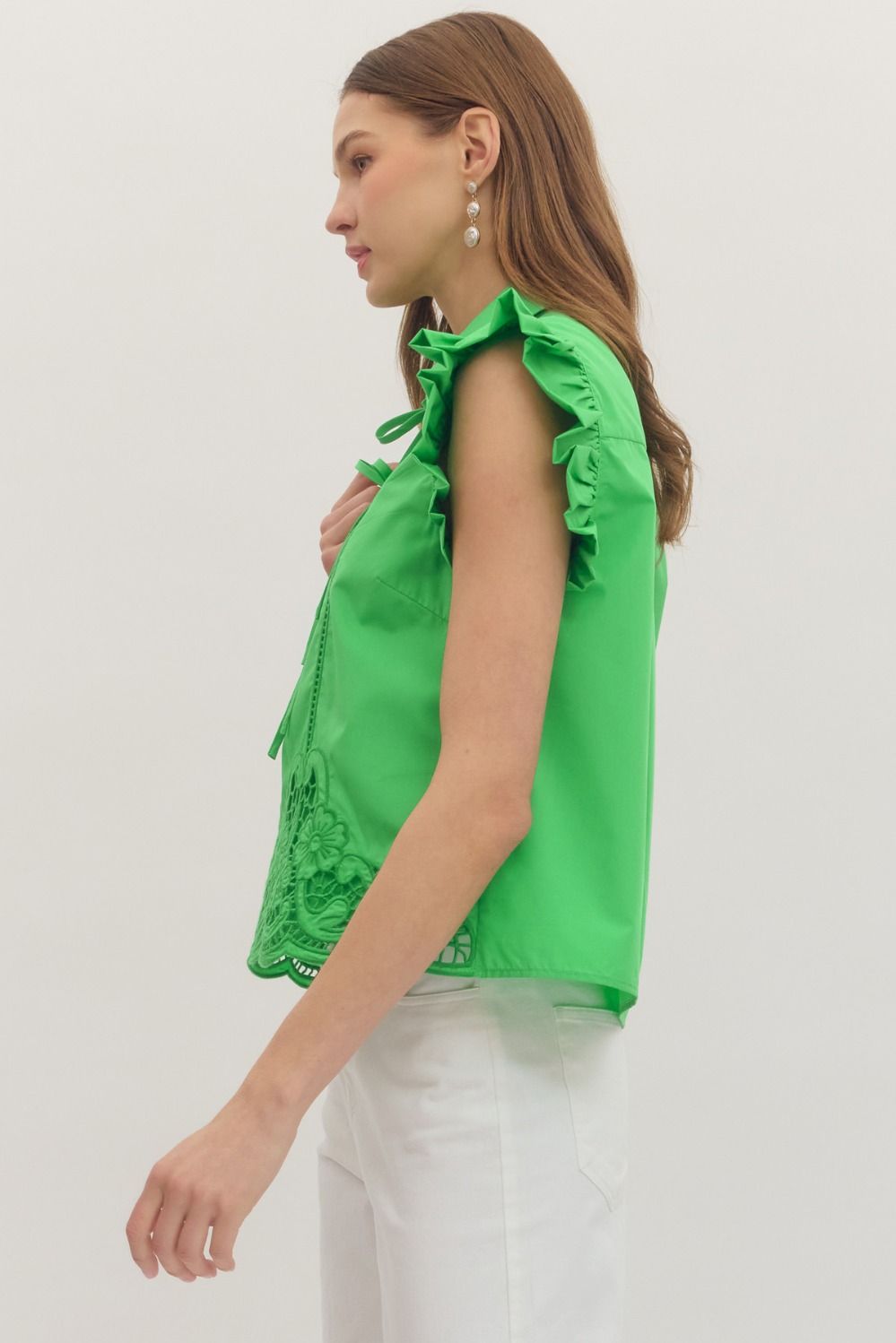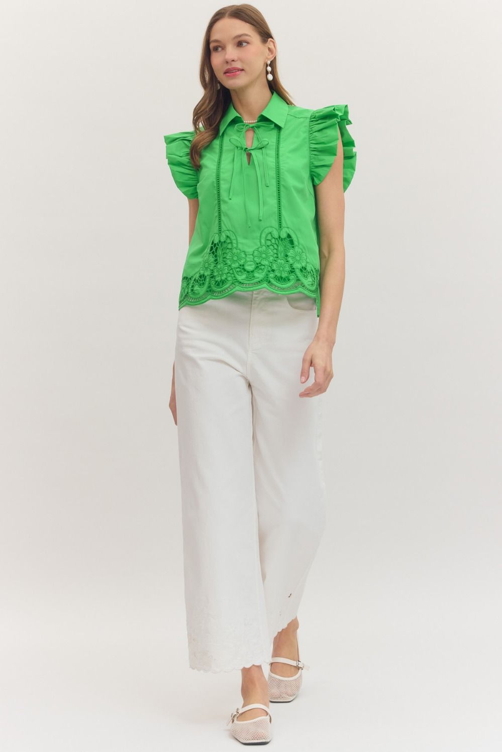 Elevate your wardrobe with this charming flutter sleeve top, designed with a graceful tie neck detail that adds a feminine touch. The scallop lace cutwork hem creates delicate visual interest, while the structured back yoke with center pleat ensures a flattering silhouette. Perfect for layering or wearing solo, this versatile piece transitions seamlessly from casual days to dressed-up occasions.