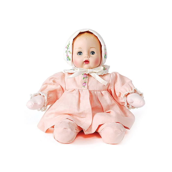 This beautiful baby doll with blue eyes and light brown painted hair is dressed in a pink linen coat and matching footed pants. The coat, with a full skirt, yoke and long sleeves, has pink and green embroidery on the center-front and off-white lace at the wrists. It also has a Peter Pan collar with floral embroidery and white lace trim. She is also dressed in a pink linen bonnet with white linen ties and a folded back, and white linen brim with an embroidery accent to complete this baby's outfit. Ages 2+.