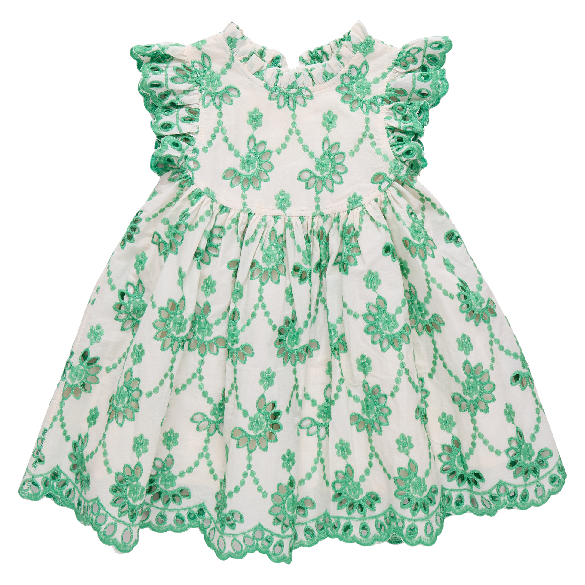 A beautifully detailed dress designed with classic craftsmanship in mind! This fully lined style features intricate green eyelet embroidery throughout, complemented by a scalloped embroidered hem and sleeves. A soft ruffle neckline adds a romantic finishing touch, making this dress perfect for spring gatherings, celebrations, and picture-ready moments.