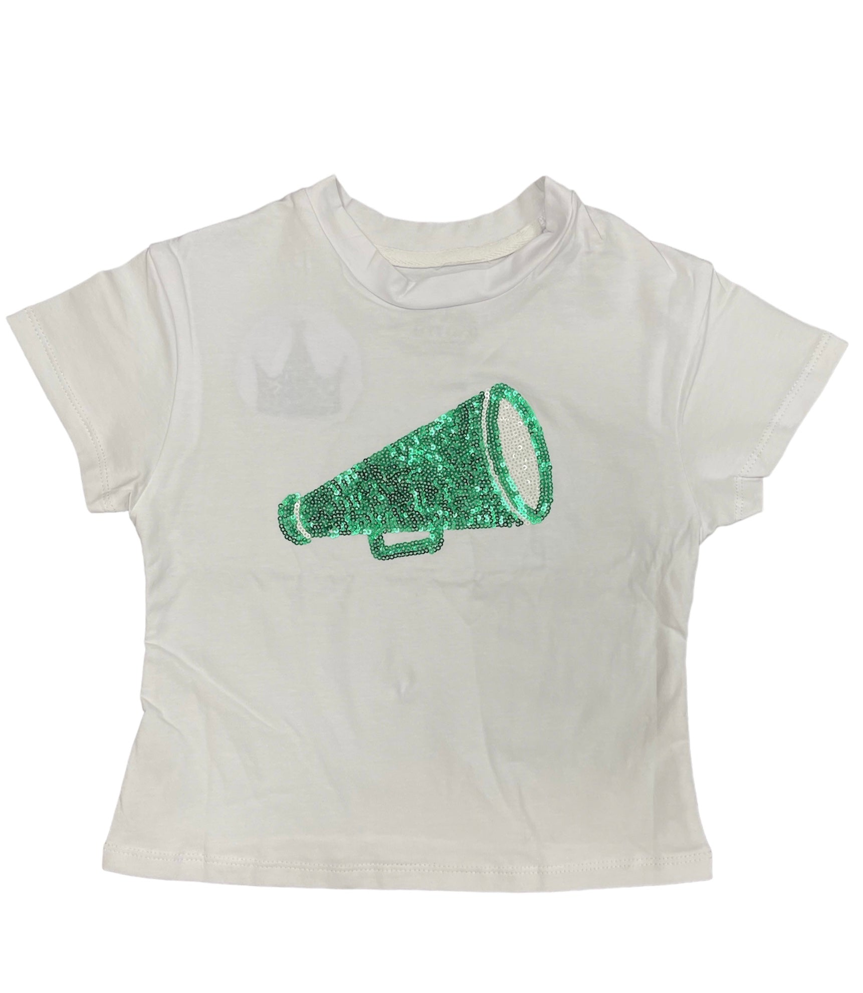 The Azarhia Green Megaphone Sequin Tee is a spirited and flashy shirt adorned with a green sequin megaphone graphic, perfect for adding a touch of sparkle to your game day ensemble.