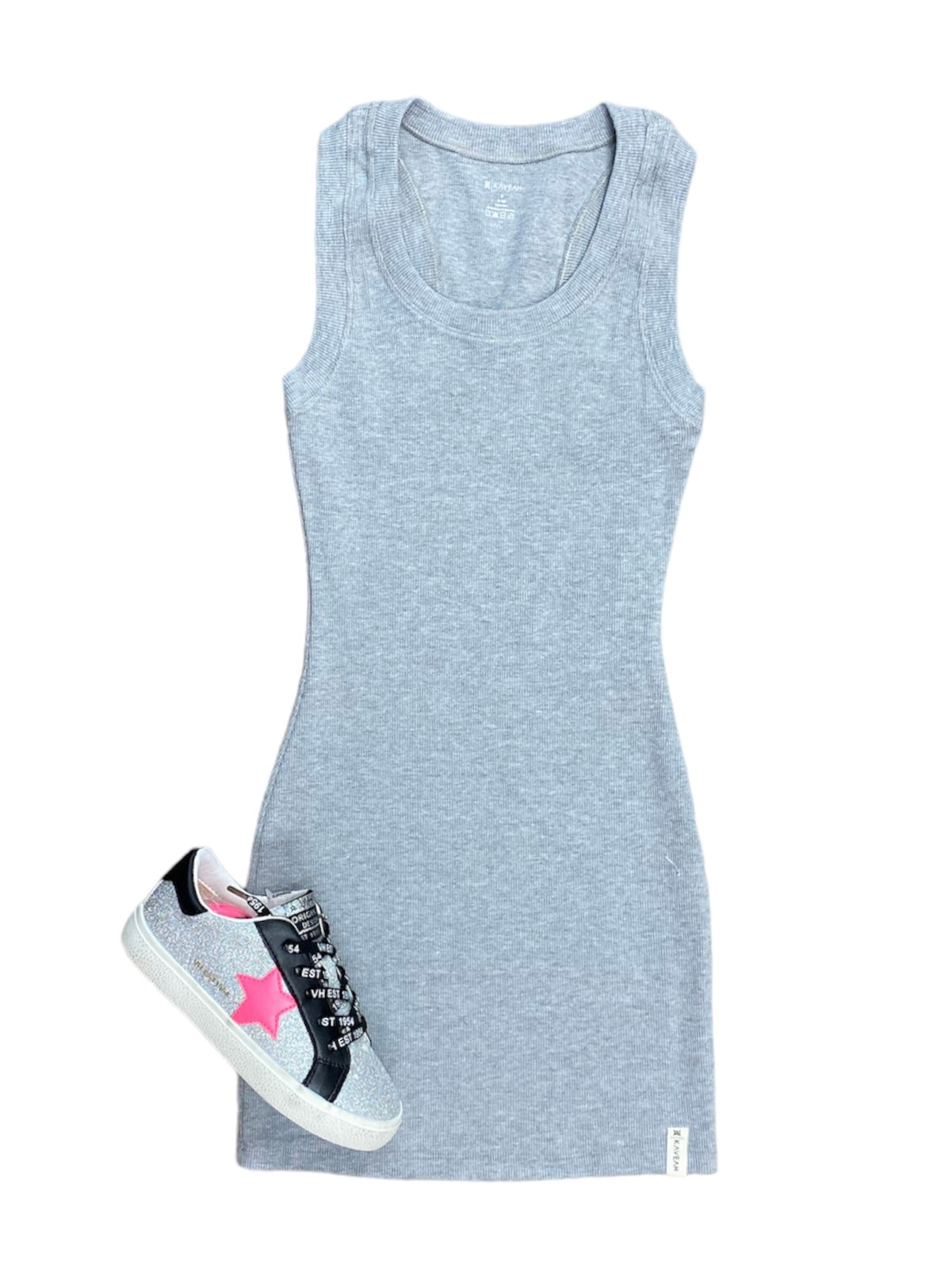 A versatile and stylish tank dress in a grey ribbed fabric, ideal for adding a touch of casual elegance.
