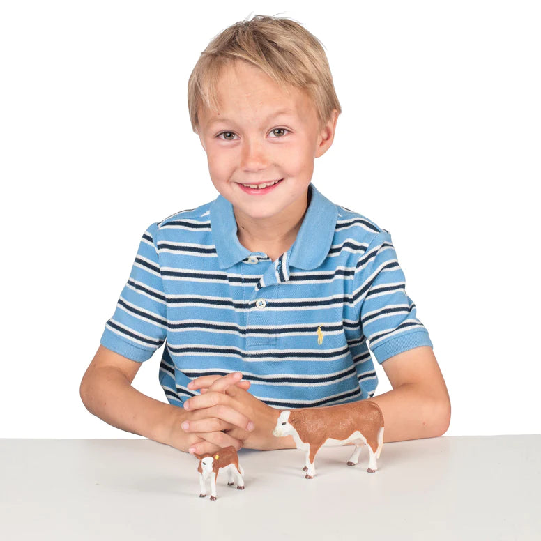 Our 1:20 scale hand-painted Hereford Cow and Calf are perfect for pretend farm and ranch play! Build your own herd of Hereford cattle or mix and match them with our other breeds.