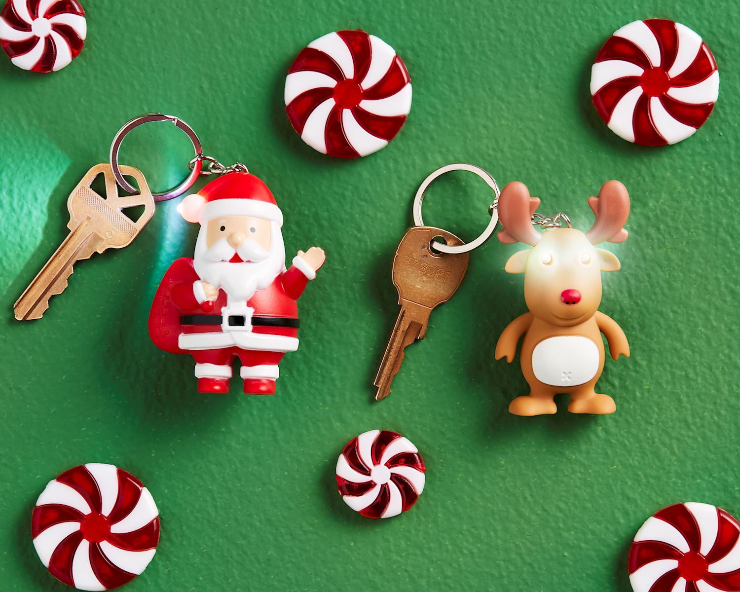 Celebrate the holiday season on the go with the Santa and Reindeer Musical Keychain! This festive keychain features a light-up Santa character that plays a cheerful holiday tune, making it the perfect accessory for your keys, bags, or backpacks. It comes packaged in a charming ornament-shaped box, making it ideal for gifting. Batteries are included, so the holiday fun begins right away!