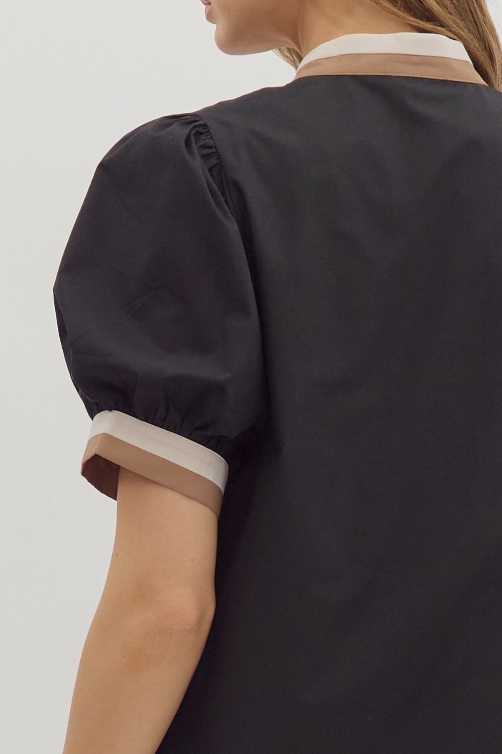Solid short sleeve pullover mini dress featuring multicolor band accent. Pockets at sides. Lined. Woven. Non-sheer. Lightweight.