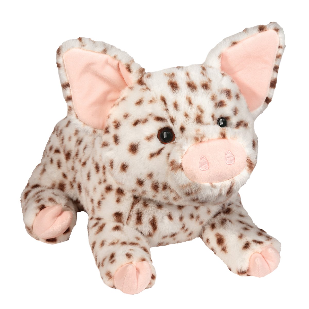 Go whole hog with Palmer the Jumbo Pig stuffed animal! This luxurious lapful of farmyard fun is as plump and adorable as one could hope for! Palmer’s oversized ears and large, brown eyes lend him a sweet expression that will run off with your heart. Premium plush materials dappled with brown spots are as appealing to pet and cuddle as they are to look at. We’ve embellished his snout with embroidered nostrils, while his four, pink feet feature cloven detail and his back end is accented with a squiggly, pink tail. For a piggy pal who bounces back after every affectionate hug, we’ve selected only the highest quality polyester fill and have gently weighted his bottom and feet to create an irresistibly cuddly companion. Secure this divine swine for yourself, bring home Palmer the Jumbo Pig plush today!