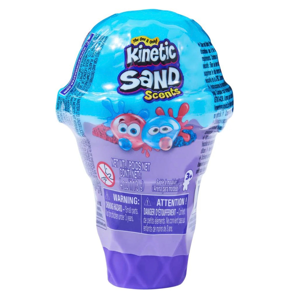 Kinetic Sand Scents just got a whole lot sweeter! Inside the Ice Cream Cone Container, discover two delightful scents of all-natural Kinetic Sand that combine to smell just like classic ice cream flavors: Mint Chocolate or Strawberry Banana! Kinetic Sand is the original magical, moldable and mesmerizing sand. It flows through your hands and never dries out, so you can play again and again. Pop the ice cream scoop off of your container to reveal 2oz of each scented Kinetic Sand color! Play with the colors individually or mix them both together into your Kinetic ice cream scent, creating a new color! Use the ice cream scoop and cone as molds and store your sand inside when you`re finished playing. Create again and again and let Kinetic Sand flow through your hands. It`s so satisfying, you won`t be able to put it down and now, you won`t be able to resist smelling it! Kinetic Sand is non-toxic and hypoallergenic. It`s made from natural sand and is wheat, gluten and casein free.