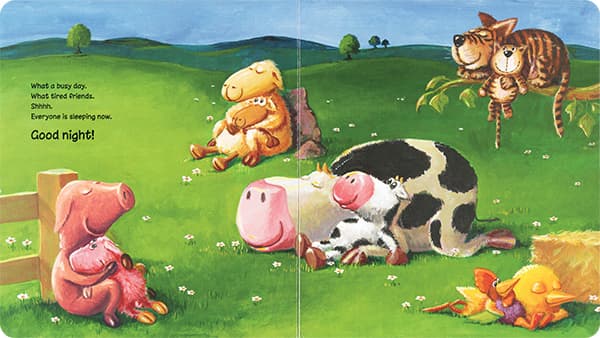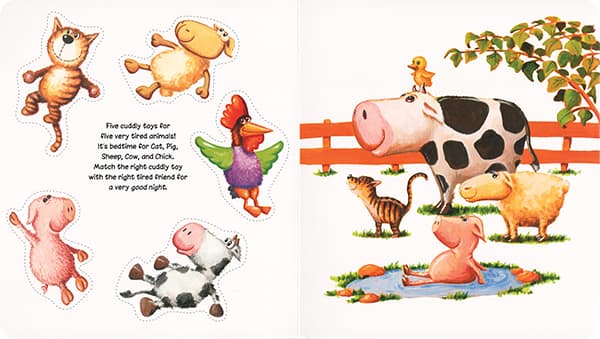 In this book, children will practice putting 5 friends to bed by giving them kisses, cuddles, and a matching reusable sticker buddy to snuggle up with before saying good night. What a great book to add to your child's bedtime routine, as it's a fabulous book to cuddle up with! Dog, Mouse, Pig, Chick, and Cow have been busy playing all day, but now it’s time to go to bed. They need kisses, cuddles… and a very special friend before they can say, “good night!” Little readers will love helping the friends pick out the perfect stuffed animal for bedtime using the 5 repositionable, reusable stickers.