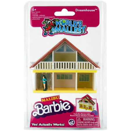 - Includes 1 miniature Malibu Barbie Dreamhouse, 1 miniature figure, 2 re-stickable décor sticker sheets, 3 railings.