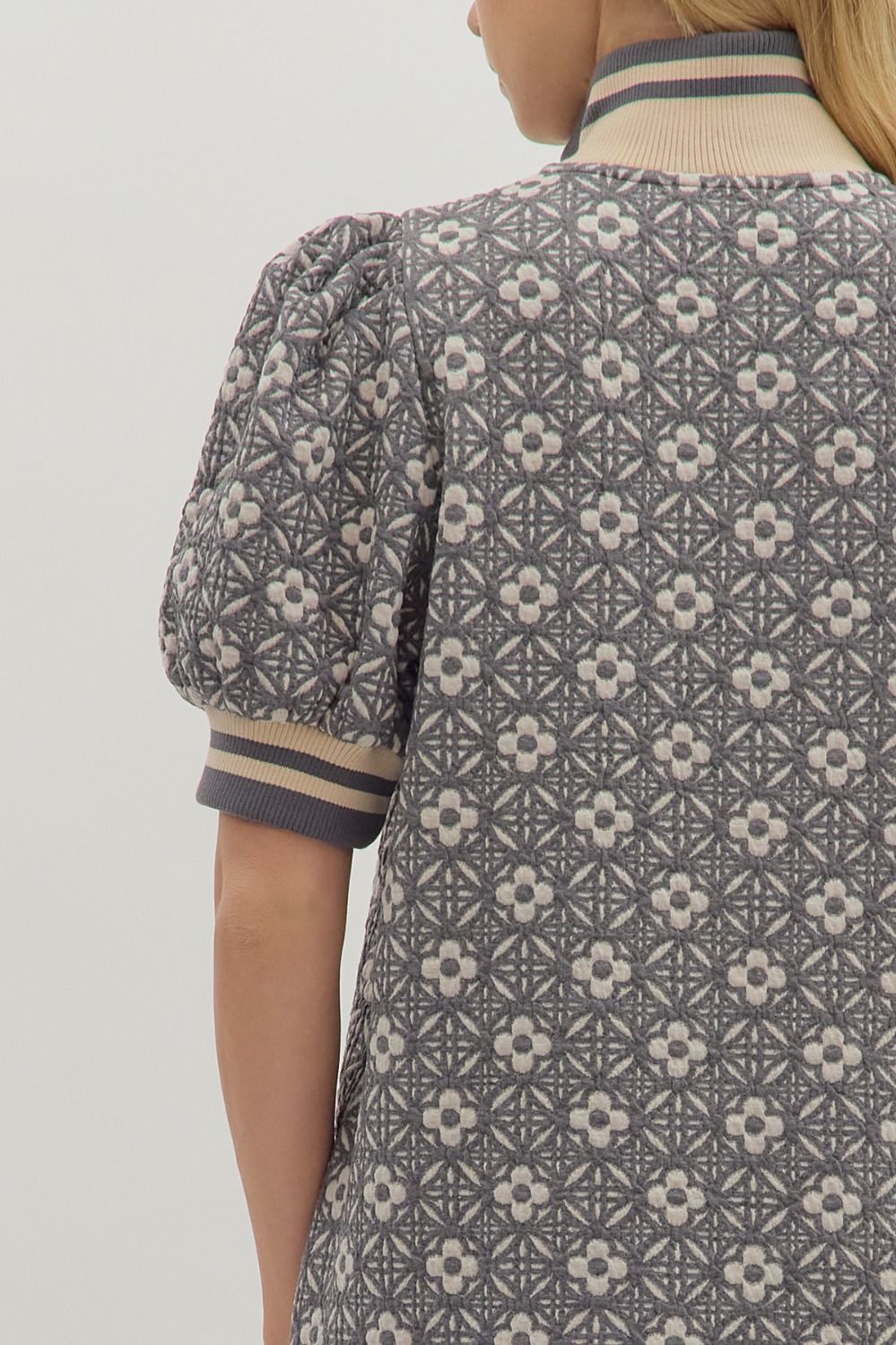 This playful mini dress brings floral texture to life with its short puff sleeves and a fun half-zip front. The ribbed collar and cuffs add a cozy touch, while convenient side pockets keep your essentials close. Crafted from medium-weight knit fabric that's non-sheer and unlined, it’s perfect for showing off your style without bulk.