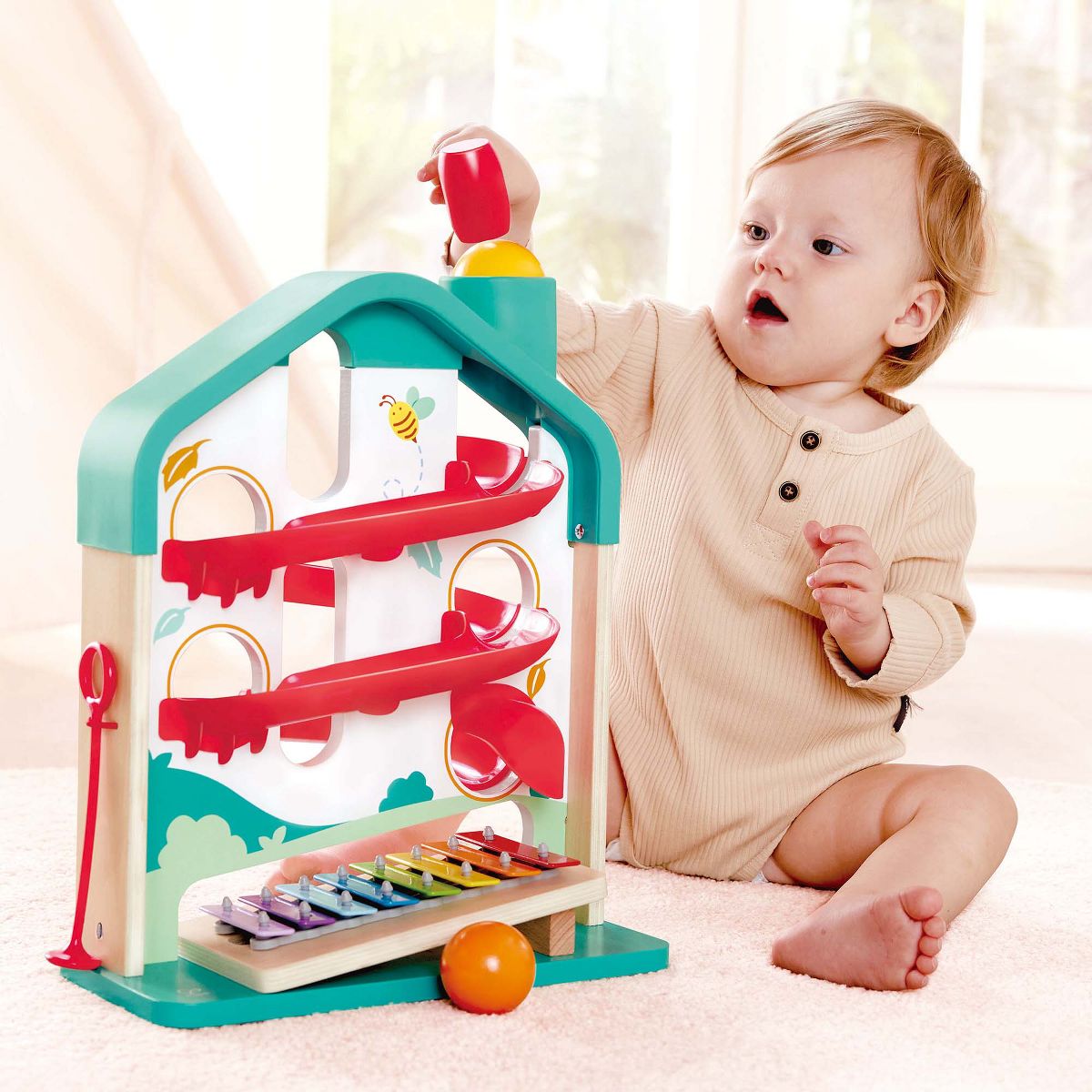 Pound the ball from the house chimney and watch it roll along the tracks. Once it falls onto the rainbow xylophone, you'll hear crisp and sweet sounds that will put a smile on your face.