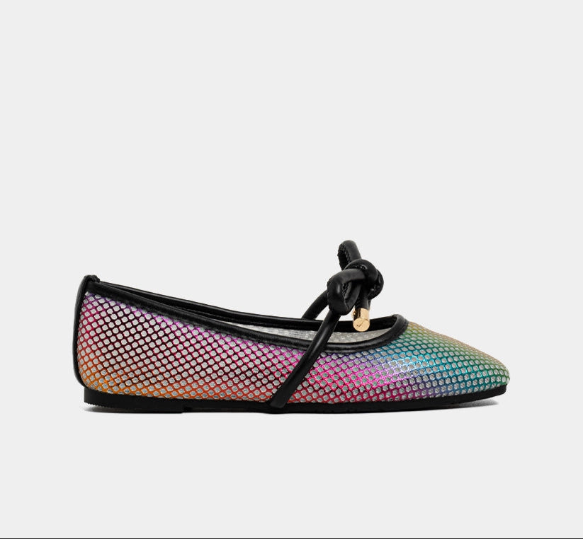 Shimmer, sparkle, and step into style. The ASHLEY MINI in Metallics is a dazzling update to the classic ballet flat. Designed with a holographic mesh effect that shifts in color and shine, this pair features soft black trim, a front bow accent, and an elastic strap for a secure fit. Lightweight and comfy, it’s the perfect mix of fashion and fun for your little trendsetter. Tiny feet, big sparkle energy.