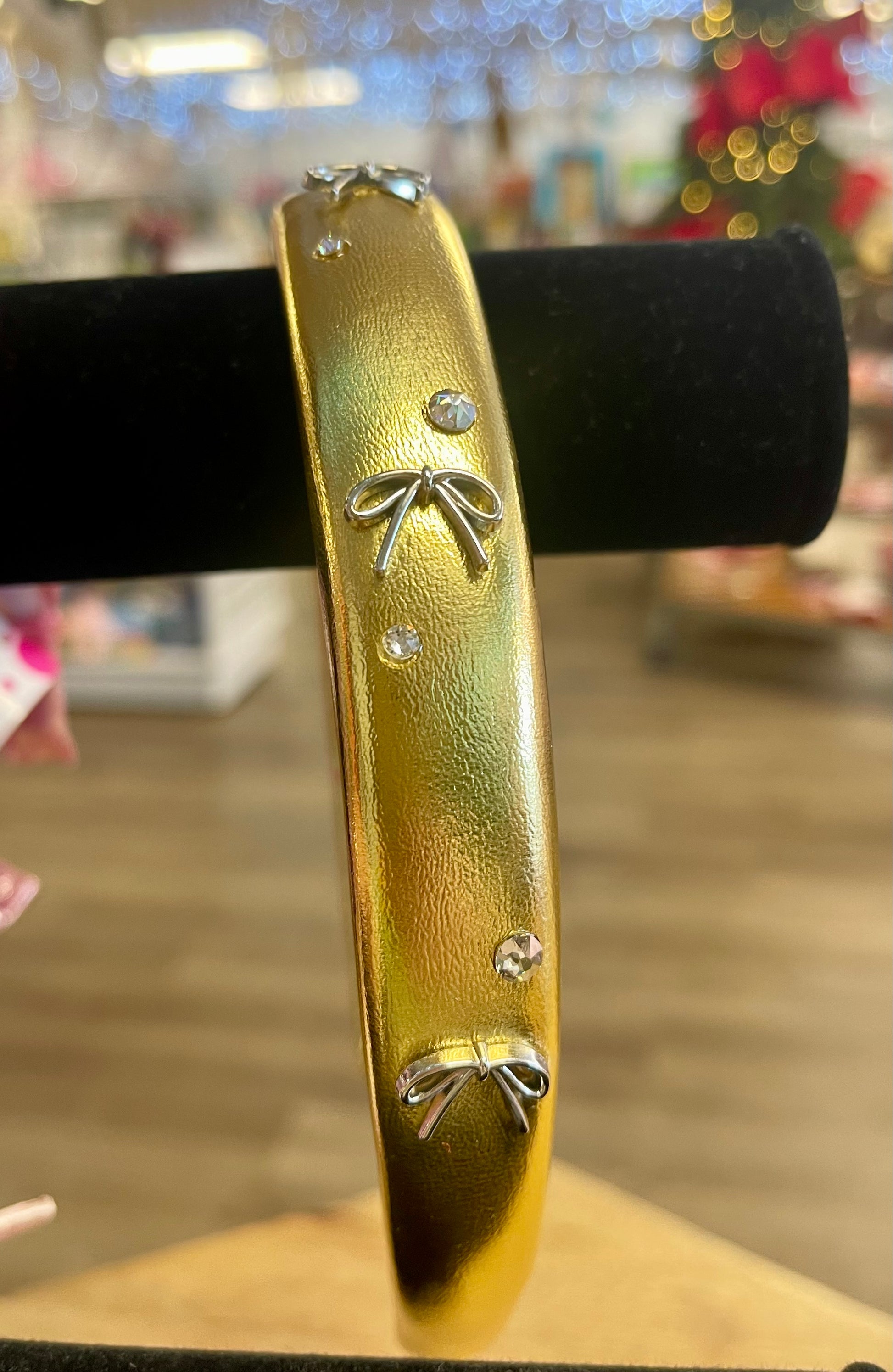 Add some shine to your hair game with this metallic headband featuring small bows. Keep your hair in place while adding a touch of fun to your look. Perfect for any occasion, this headband is a must-have for any playful and quirky fashion lover. (Bow down to fashion with this metallic headband!)
