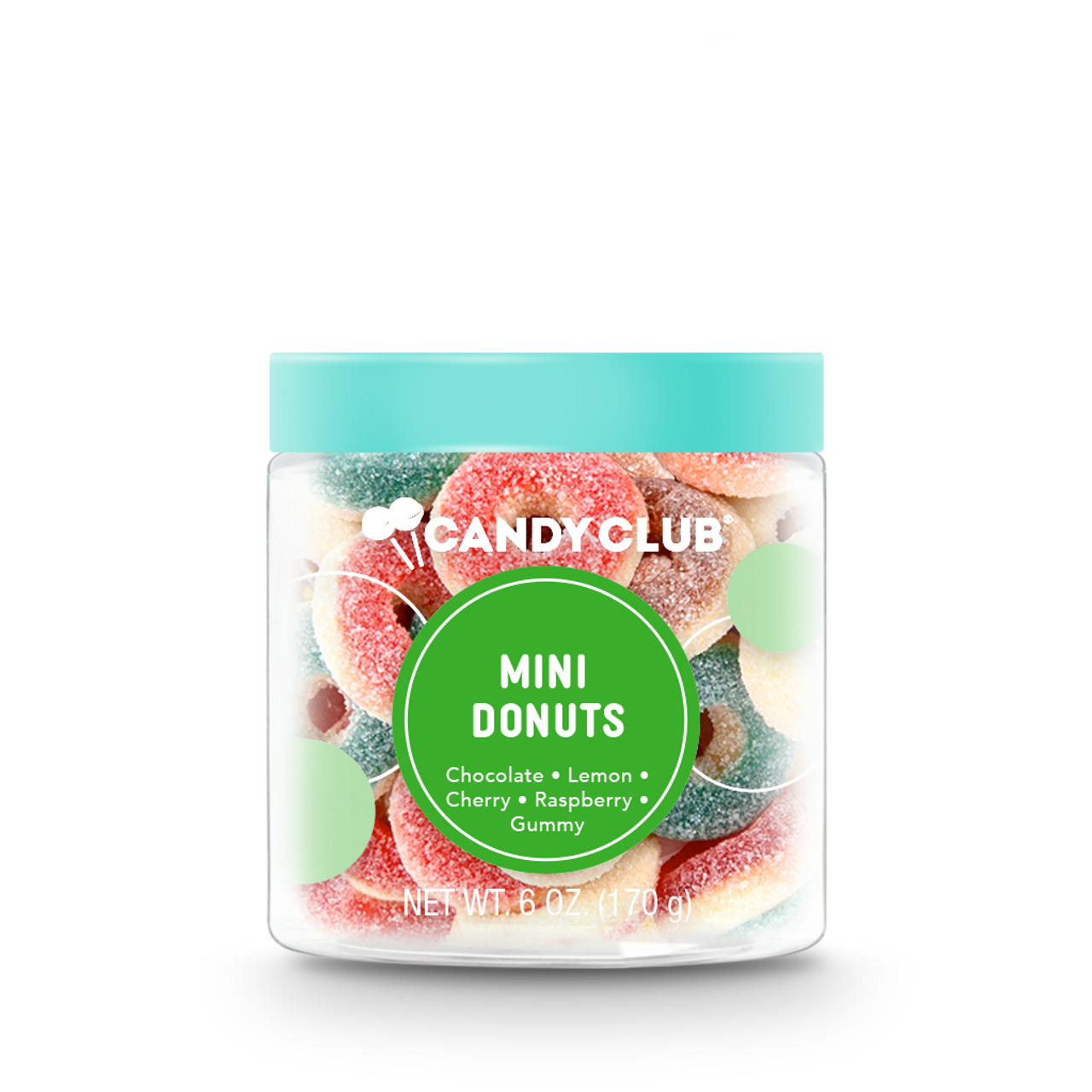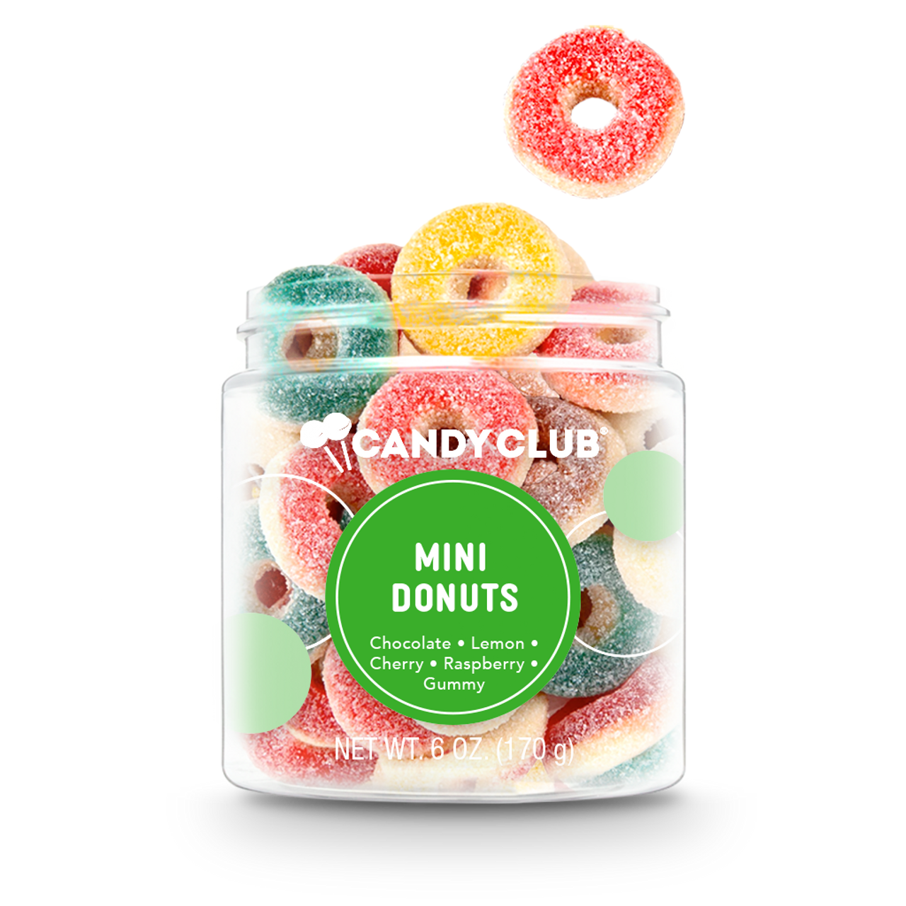 Mini gummy 'sugared' donuts in delicious mix of chocolate, cherry, lemon, raspberry and cream flavors.