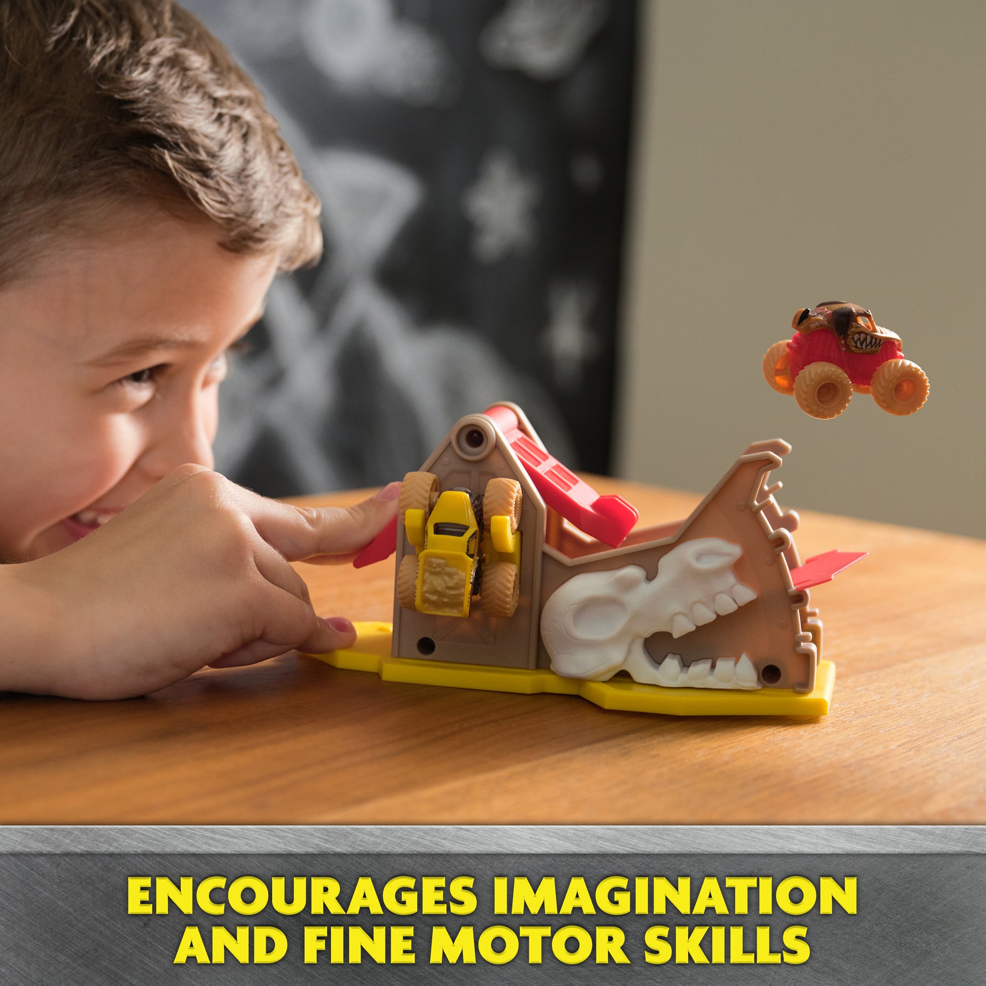 Launch into big fun with the Monster Jam Earthshaker Boneyard Blaster. The compact set that delivers Monster Jam excitement anywhere you go! Includes 2 die-cast Monster Jam truck – Monster Mutt and Earth Shaker in 1:87 scale – making it the Ideal toy gift that combines action and portability! With the Mini Launcher, adjust the ramp to their liking and send your favorite mini Monster Jam trucks flying. Whether it's a high-flying stunt or a long-distance jump, the adjustable ramp allows for a variety of thrilling stunts, perfect for the imaginative play of aspiring Monster Jam champions. Included are two mini Monster Jam vehicles that looks just like the Monster Jam trucks you see at the live shows! These mini trucks are ready to rumble straight out of the package, providing instant entertainment and the excitement of head-to-head competition. The launcher doubles as storage for both included trucks, ensuring that your little ones can easily pack up and carry their Monster Jam fun on the move. Compact, easy to use, and full of Monster Jam action, this Mini Launchers set is perfect for kids who are always on the move and ready for spontaneous play. Monster Jam toys like remote control car, RC cars, vehicles and trucks are the prime gifts as girl and boy toys, ages 3 and up., who are sure to enjoy the endless possibilities for creative stunts and races!