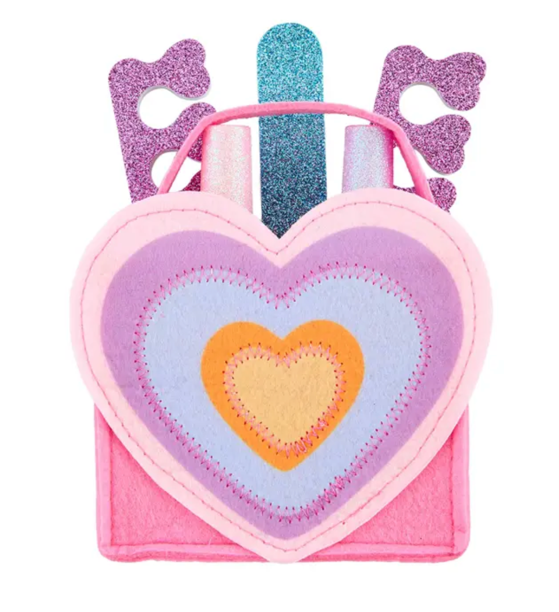 Pamper the girly girl in your life with the Heart Kid's Nail Polish Set, featuring five pieces that are sure to delight. This set includes a felt carrier tote, made from 100% polyester. Measuring 4 3/4" x 4", it's a compact and stylish accessory. The tote is designed to hold two bottles of water-based nail polish, which boast a non-toxic formula and an array of fun colors. Additionally, the set includes a pair of toe separators for a professional manicure experience and a nail file for the perfect finishing touch. Suitable for children ages 3 and older, this set offers both entertainment and creativity. Cleaning is a breeze?simply use a damp cloth for spot cleaning. Elevate your little one's nail care routine with this adorable and practical set.