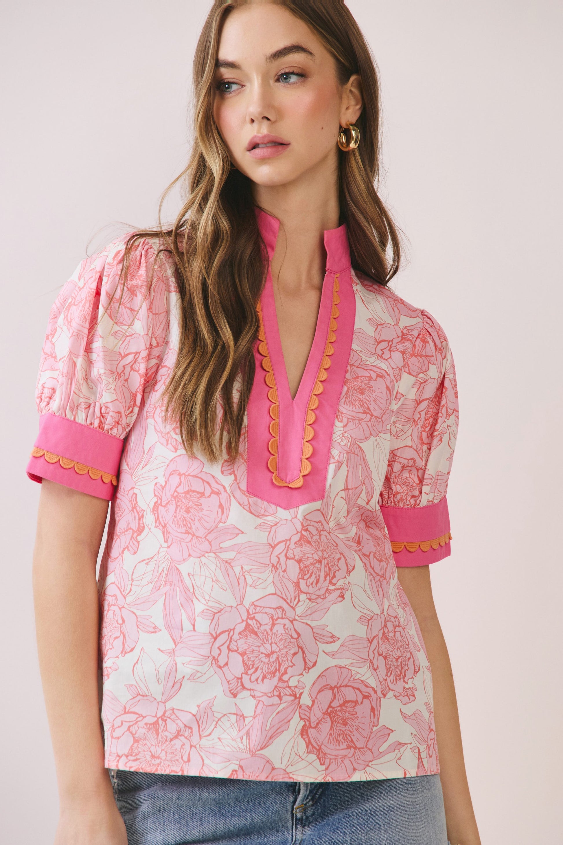 Brighten your wardrobe with this charming floral-print woven top. The split neckline is beautifully accented with delicate scalloped trim, while short puff sleeves add a playful touch. Contrast cuff detailing and subtle scalloped edges throughout create a polished, feminine look. Perfect for casual outings or dressing up with your favorite bottoms.
