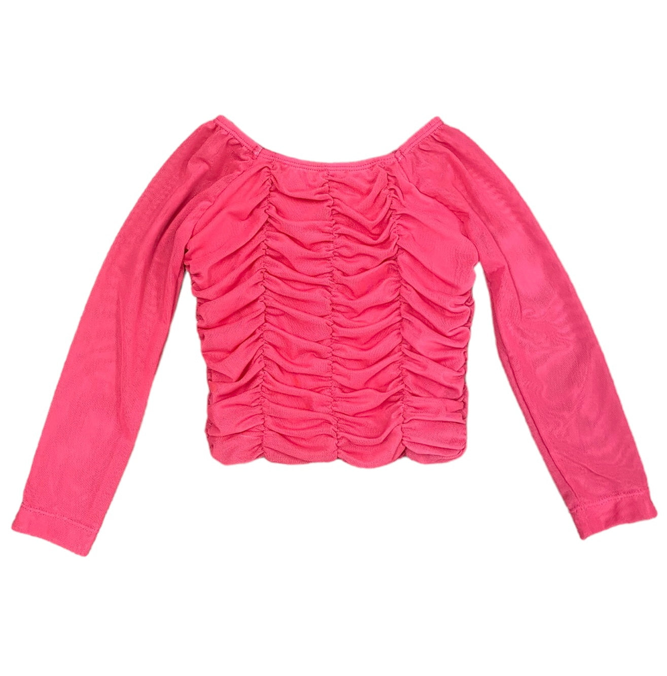 A stylish and delicate pink blouse featuring ruched details and mesh fabric, offering a fashionable addition to your child's wardrobe.
