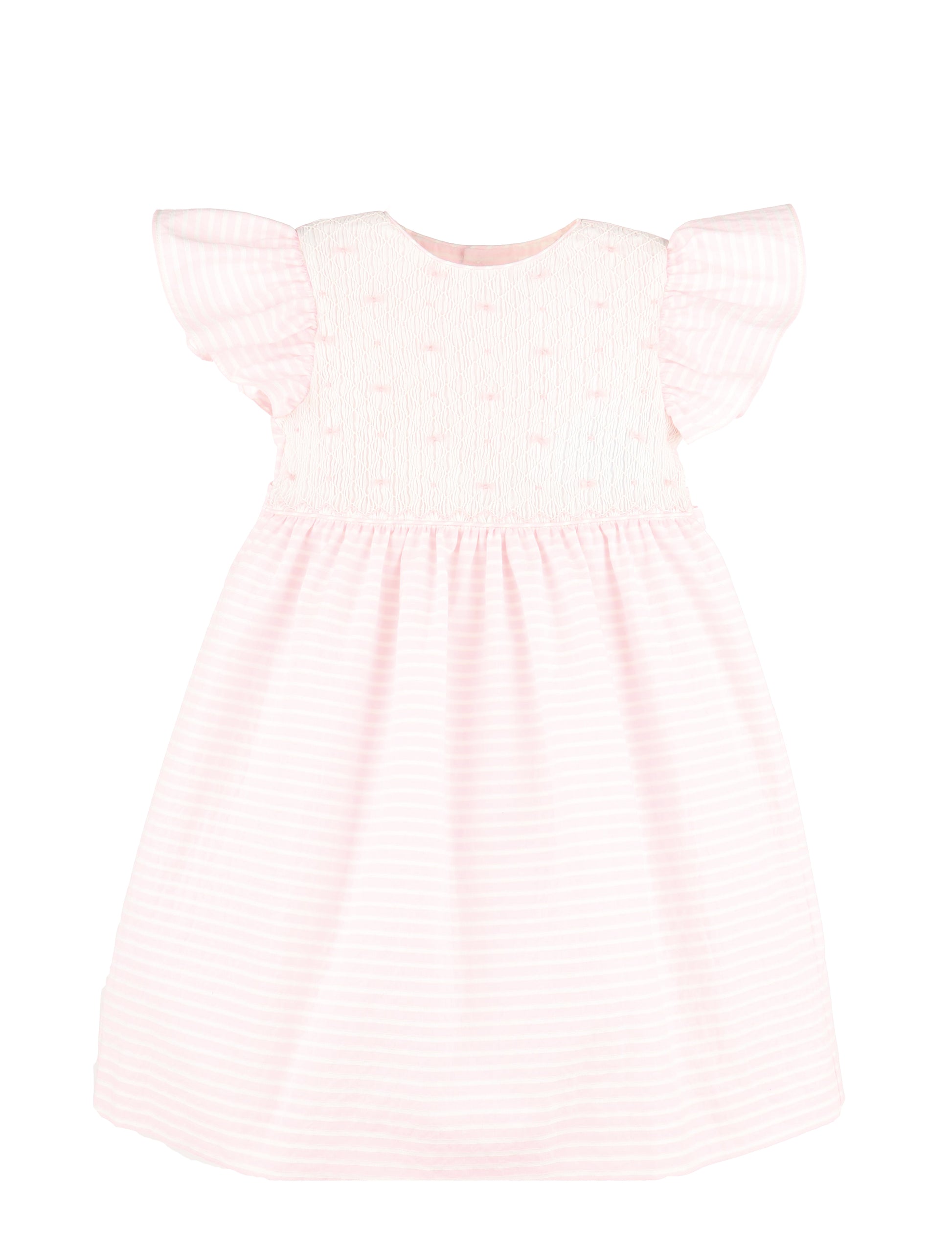 Adorable pink dress featuring delicate plumeti stripe detailing and charming smocked bodice. Perfect for special occasions or everyday wear, this piece combines classic style with playful comfort. The smocked design adds texture and allows for easy movement, while the soft pink hue works beautifully with any accessory. An essential addition to any child's wardrobe that transitions seamlessly from playdates to celebrations.