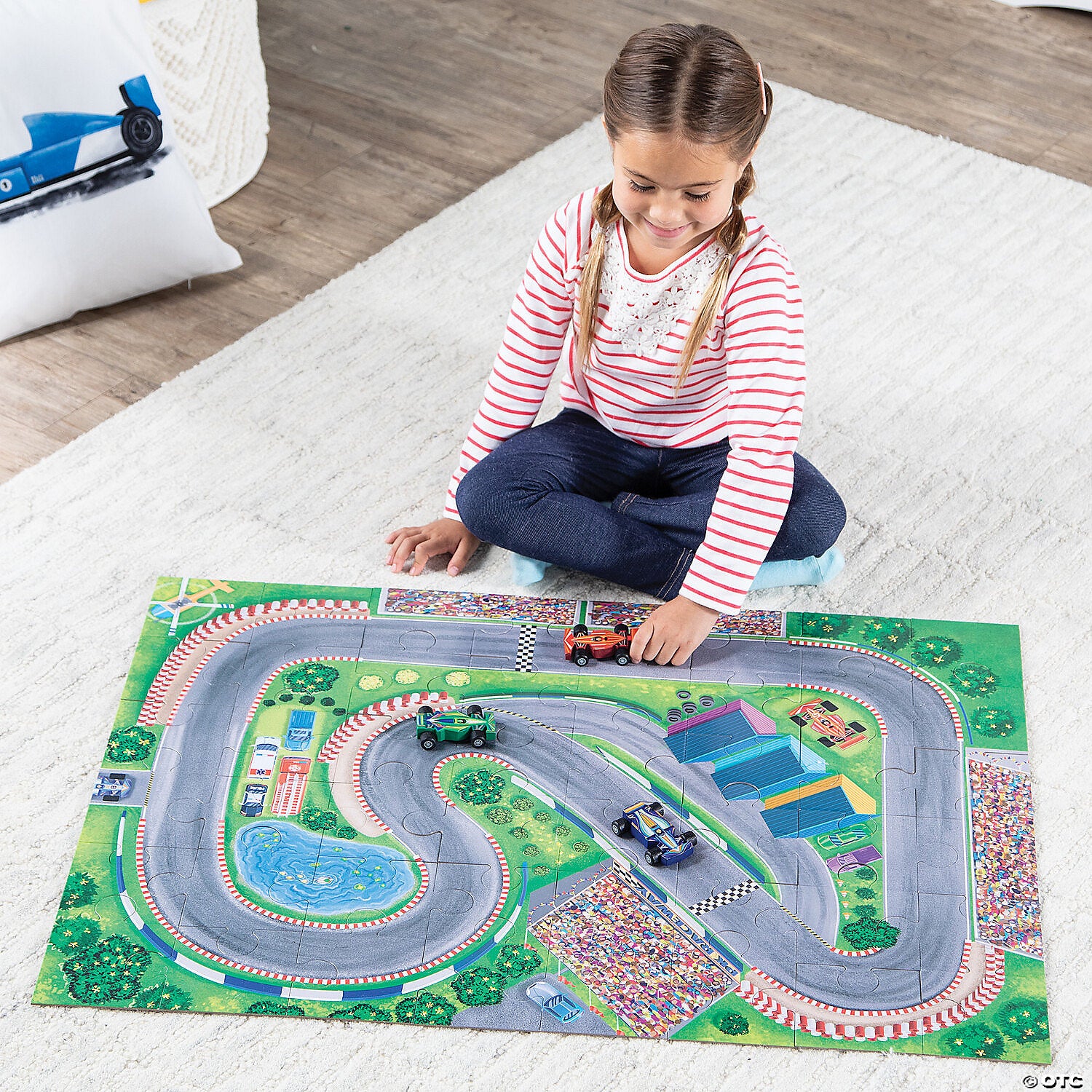 • Fuel imaginative play with this 48-piece race track floor puzzle that’s two playsets in one: first, assemble the colorful puzzle into a race track background, then zoom the wooden cars around the track
