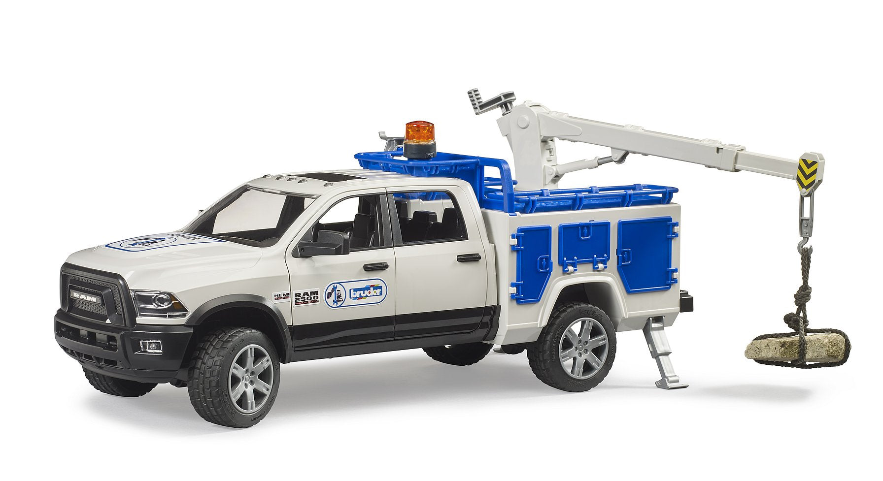 The RAM brand is highly regarded, not only in the leisure sector. This pick-up is also used as the basis for a large number of commercial vehicles, as this model was developed as a heavy-duty pick-up truck by RAM. The RAM Service Truck is the latest addition to the commercial vehicle sector. It is used where repair and service work is carried out on large machines, e.g. in agriculture, or on construction sites. For this purpose, it is equipped with a rotatable and extendable assembly crane. The necessary tools and spare parts can be stored in the numerous compartments. Familiar features such as the steering wheel extension and spring-loaded axles are also present, as is an all-round light to protect the vehicle. For even more fun, the bworld mechanic (item no. 62100) and the bworld construction set (item no. 62007) complement this versatile vehicle.