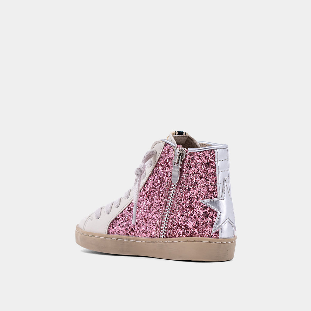 The ROONEY MINI in Rose Glitter is designed for bold and dazzling style for your little one. This high-top sneaker, covered in shimmering rose glitter and accented with sleek faux leather, makes a statement with every step. Suitable for kids and toddlers, it features a cushioned sole for all-day comfort and a convenient zipper for easy wear. Let your mini fashionista shine in the ROONEY MINI!