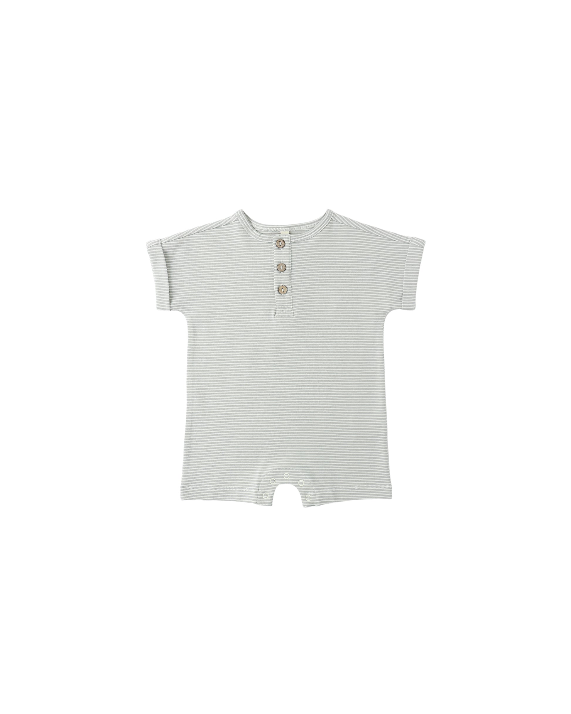 Adorable sage and cream striped romper perfect for little ones who love comfort and style! This playful one-piece features soft micro-striped fabric that's gentle on delicate skin. The relaxed fit allows plenty of room for crawling, playing, and all those precious moments. Easy snap closures make diaper changes a breeze, while the timeless stripe pattern pairs beautifully with any accessory. A wardrobe essential that's as fun to dress up as it is to dress down!