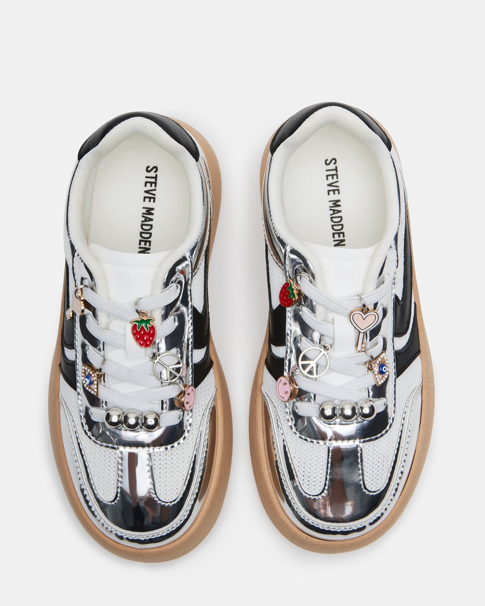 Introducing the kids JERSEY CHARMS - a trendy platform sneaker designed for active kids. With its low-top and lace-up design, this shoe provides both style and functionality for everyday wear. With its sleek silver color, your child will be the coolest kid on the block.
