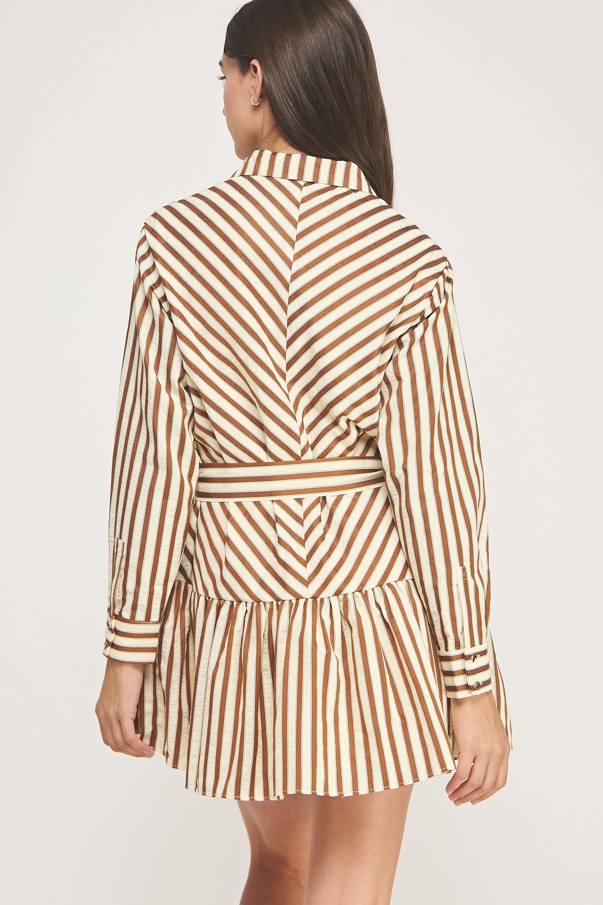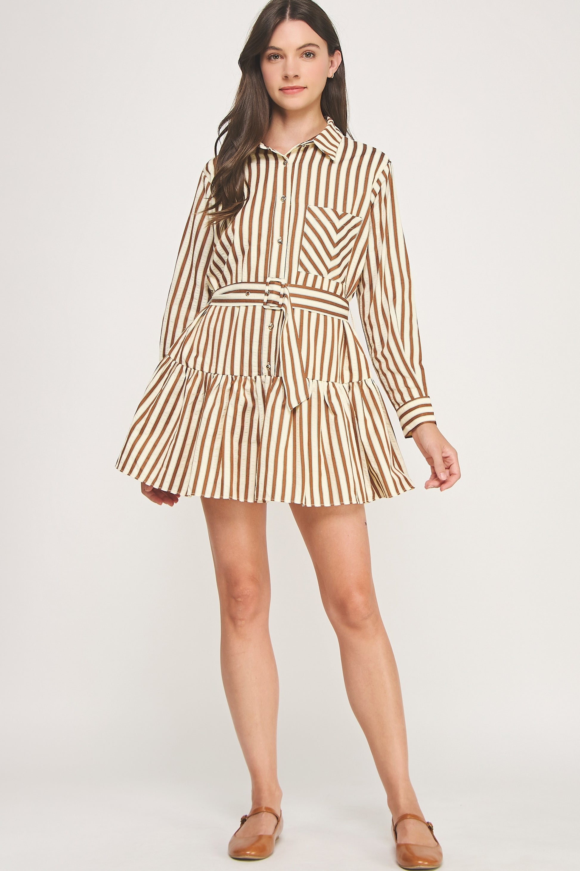 Step into sparkle with our Strut and Bolt button-down mini dress! Crafted from shimmering striped textured fabric, this playful piece features long sleeves with button cuffs, a spread collar, and a handy chest pocket. The removable belt lets you mix up your look, while the ruffled shirred hem adds a flirty finish. Fully lined for comfort and buttoned down the front for easy wear, this dress is made to turn heads wherever you go.