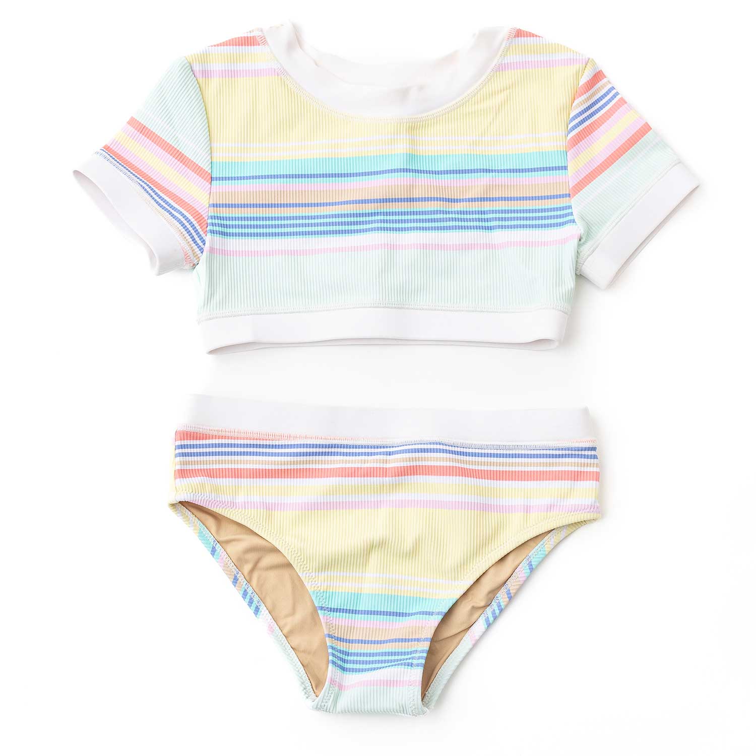Catch some waves in style with this vibrant Surfer Stripe Short Sleeve Bikini! Featuring bold, eye-catching stripes that channel beachy vibes, this two-piece is perfect for pool days, beach trips, or just feeling like a surfer girl. The short sleeves add a fun twist to the classic bikini silhouette, offering a little extra coverage while keeping things cool and comfortable. Whether you're paddling out or lounging by the shore, this playful swimwear is ready for adventure!