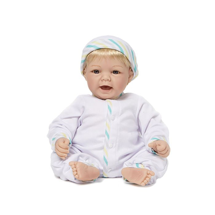 Designed to look and feel like a real baby, Sweet Baby has a light skin tone, blonde hair and blue eyes and looks ready to burst into a giggle. Our Newborn Nursery dolls are 19” and feel so real, thanks to a soft, weighted fabric body, molded head and limbs, and wispy hair. They feature beautiful classic Lee Middleton sculpts. Encouraging nurturing play, this is the perfect baby doll for your child to pretend being a little parent! Ages 3+