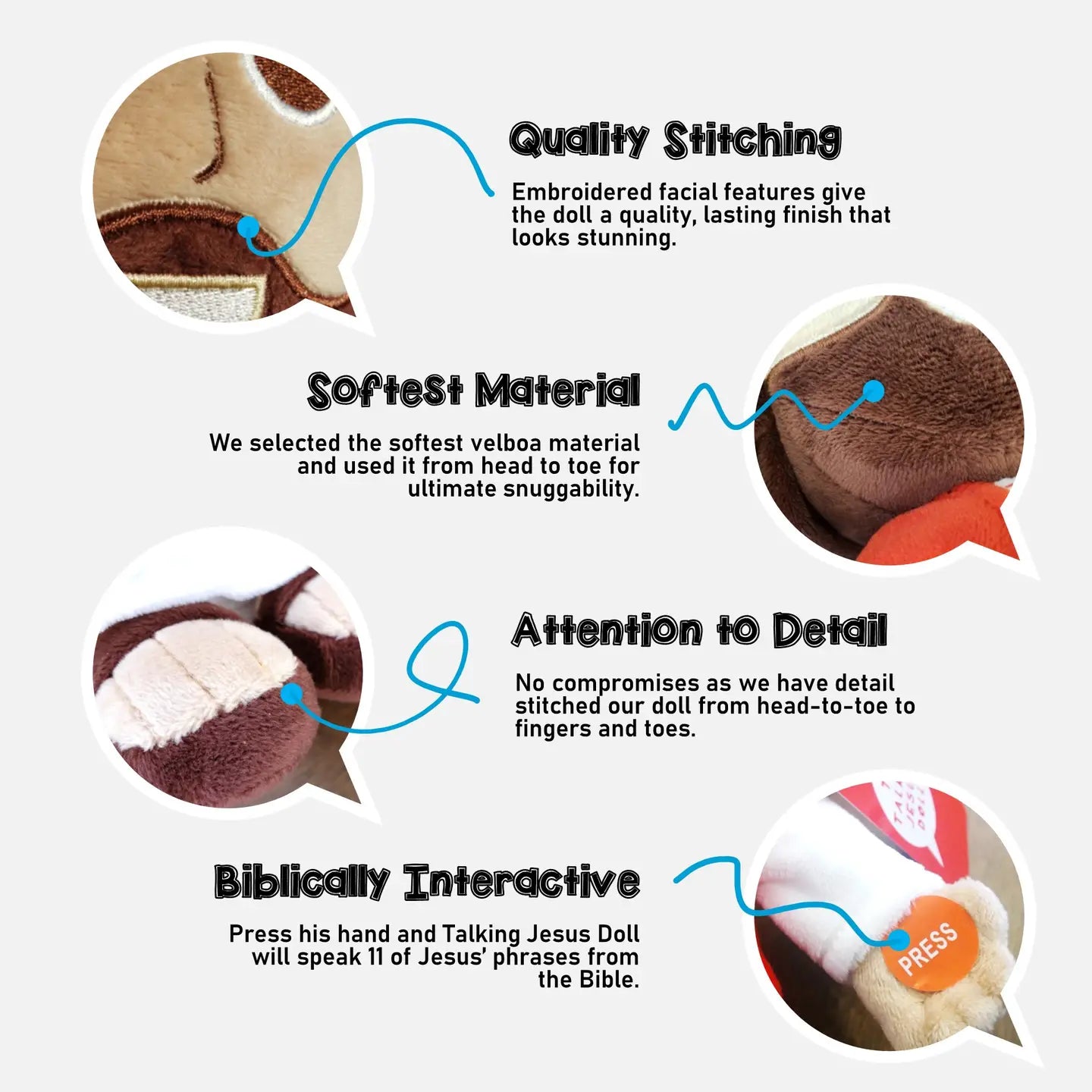 The Talking Jesus Doll is a beautiful 12" plush Jesus that speaks 10 phrases that Jesus said in the Bible. Jesus welcomes children with his outstretched arms, warm smile and a super-soft body. Children LOVE to squeeze his hand to make him talk. Parents and grandparents LOVE that their little ones are learning Jesus' important teachings from the Bible. Perfect for Christmas or for Christian Easter baskets. More than a toy, it opens up kids to Christ. Teach your kids before the World does. He says: For God so loved the World, that he gave his only son... John 3:16 The Lord's Prayer. Our Father, who art in heaven... Matthew 6:9 Love the Lord your God with all your heart.. Mark 12:30 Love your neighbor as yourself. Mark 12:31 I am the way, the truth and the life. John 14:6 With God, all things are possible. Mark 10:27 Treat others the way you want to be treated. Luke 6:31 I am the light of the world. John 8:12 Peace be with you. John 20:19 Follow me. Matthew 9:9 I love you.
