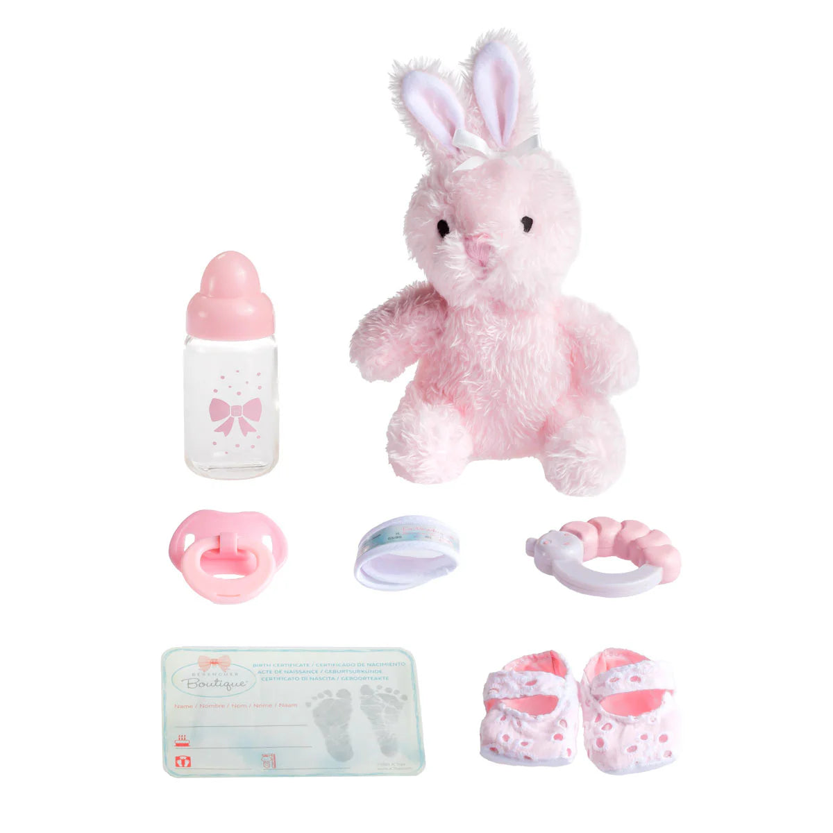 This doll is a 15” vinyl, anatomically correct “real girl” baby-doll with a jointed body that enables her to assume various poses. Designed by Berenguer, she is dressed in a light pink eyelet outfit with a big matching bow. She has lifelike eyes, an inquisitive expression, and realistic ears, lips, and nose. As part of a Deluxe Gift set, she comes with an assortment of pink-trimmed accessories including a bottle, rattle, pacifier, and a little fluffy bunny plush toy. The set even includes a birth certificate!