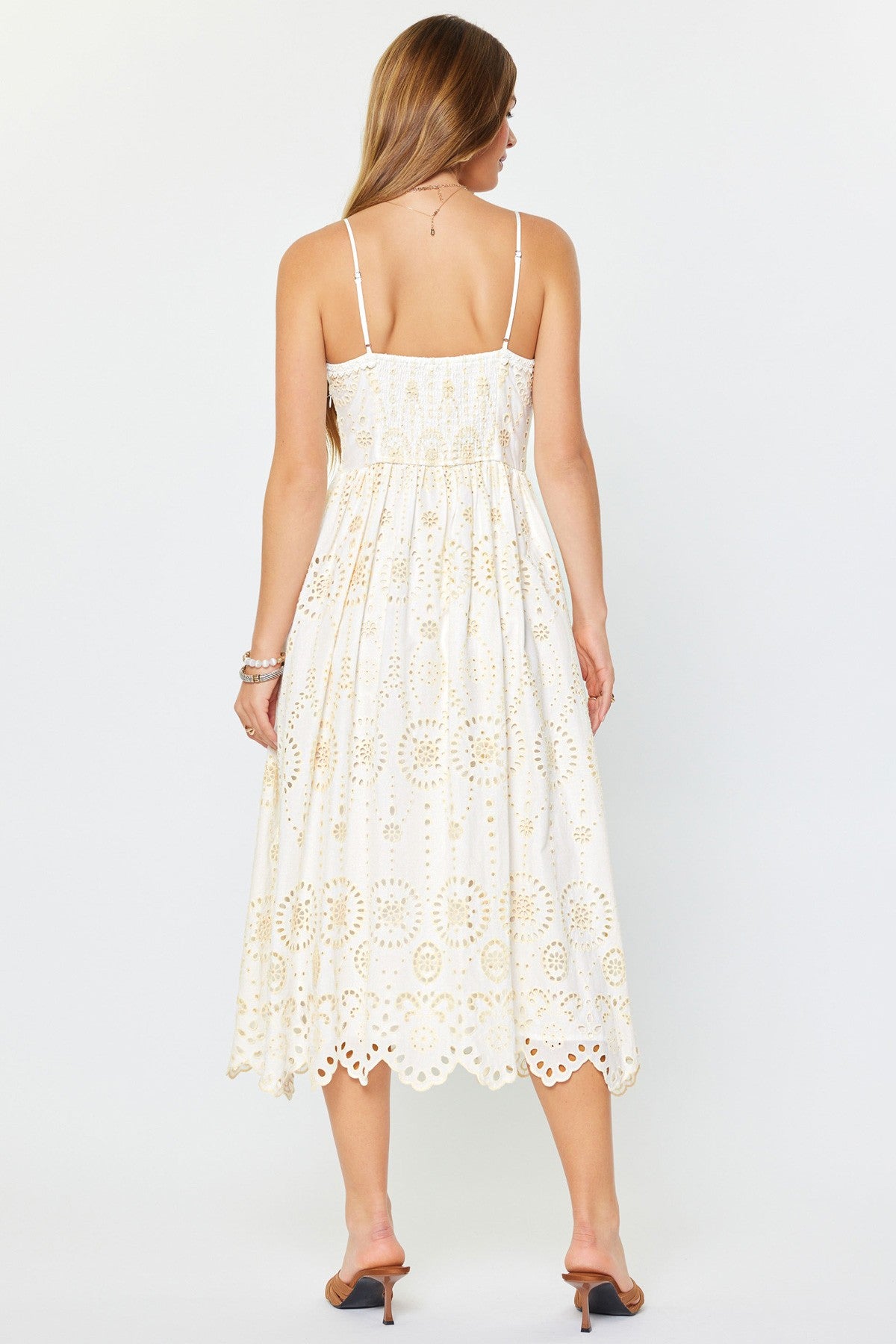 Charming eyelet embroidered cotton dress featuring a square neckline trimmed with delicate lace and adjustable spaghetti straps for a custom fit. The smocked back provides gentle shaping while the midi length with scalloped hem adds vintage-inspired elegance. Practical side pockets keep essentials close, and the inner lining ensures comfort all day long. Perfect for warm weather gatherings and special occasions.