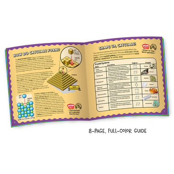A fun, eight-page, full-color experiment guide takes you through cracking open the geodes and provides exciting educational content about these amazing natural wonders. Scan the QR code to access exclusive podcast content including scientific info about how geodes form and fascinating facts about geodes, all explained by Wow in the World’s Guy Raz and Mindy Thomas! The kit also includes a magnifying glass and a pair of safety goggles to add to your collection of classic STEM tools.